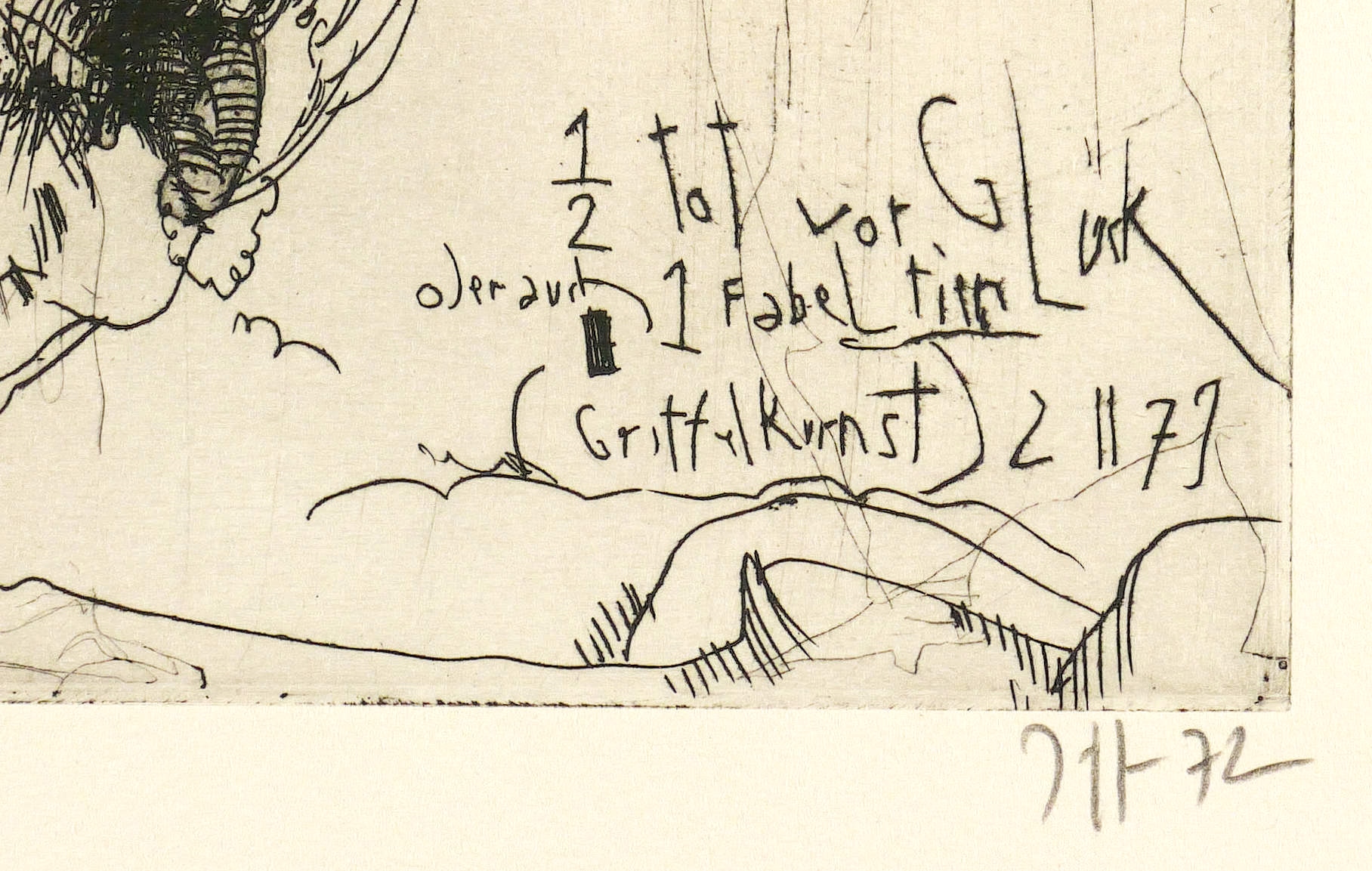 Frielinghaus 111. Kruglewsky 37. – Rechts unten in Bleistift signiert und datiert. In der Darstellung rechts unten betitelt sowie bezeichnet: ″(Griffelkunst) 2 11 72″. – Bisweilen unter dem Titel ″Halb tot vor Glück - Selbstbildnis″ laufend. – Sehr gut erhalten.