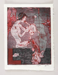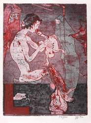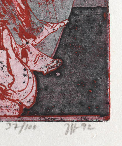 1992. Farbradierung / Aquatinta & Strichätzung, in Rot, Blau & Schwarz, auf hellchamois Simili-Japan. – Von Horst Janssen. – Auflage Exemplar Nr. 37/100. – 24,0 x 18,0 cm (Darstellung / Platte), 28 x 21 cm (Blatt).