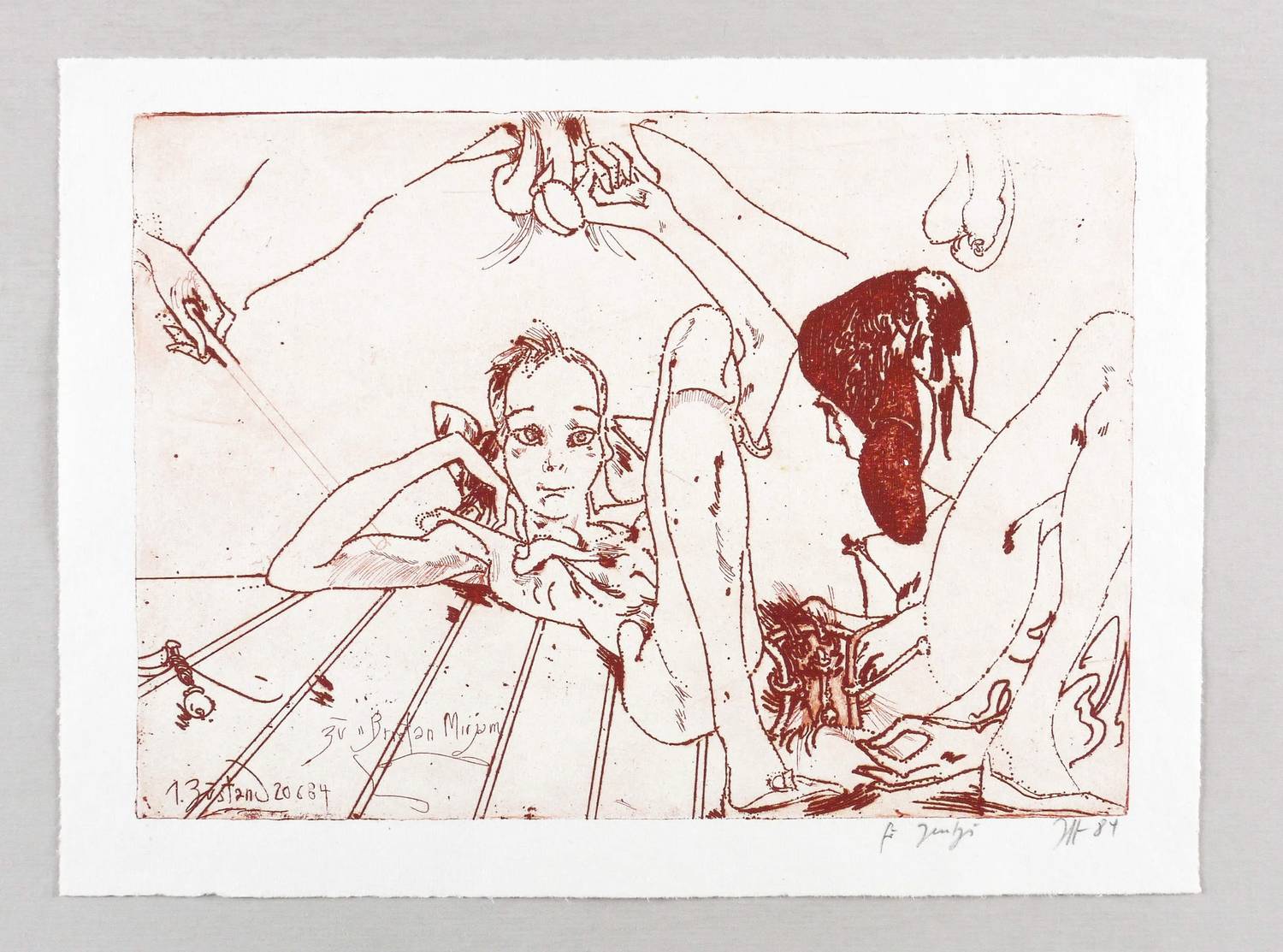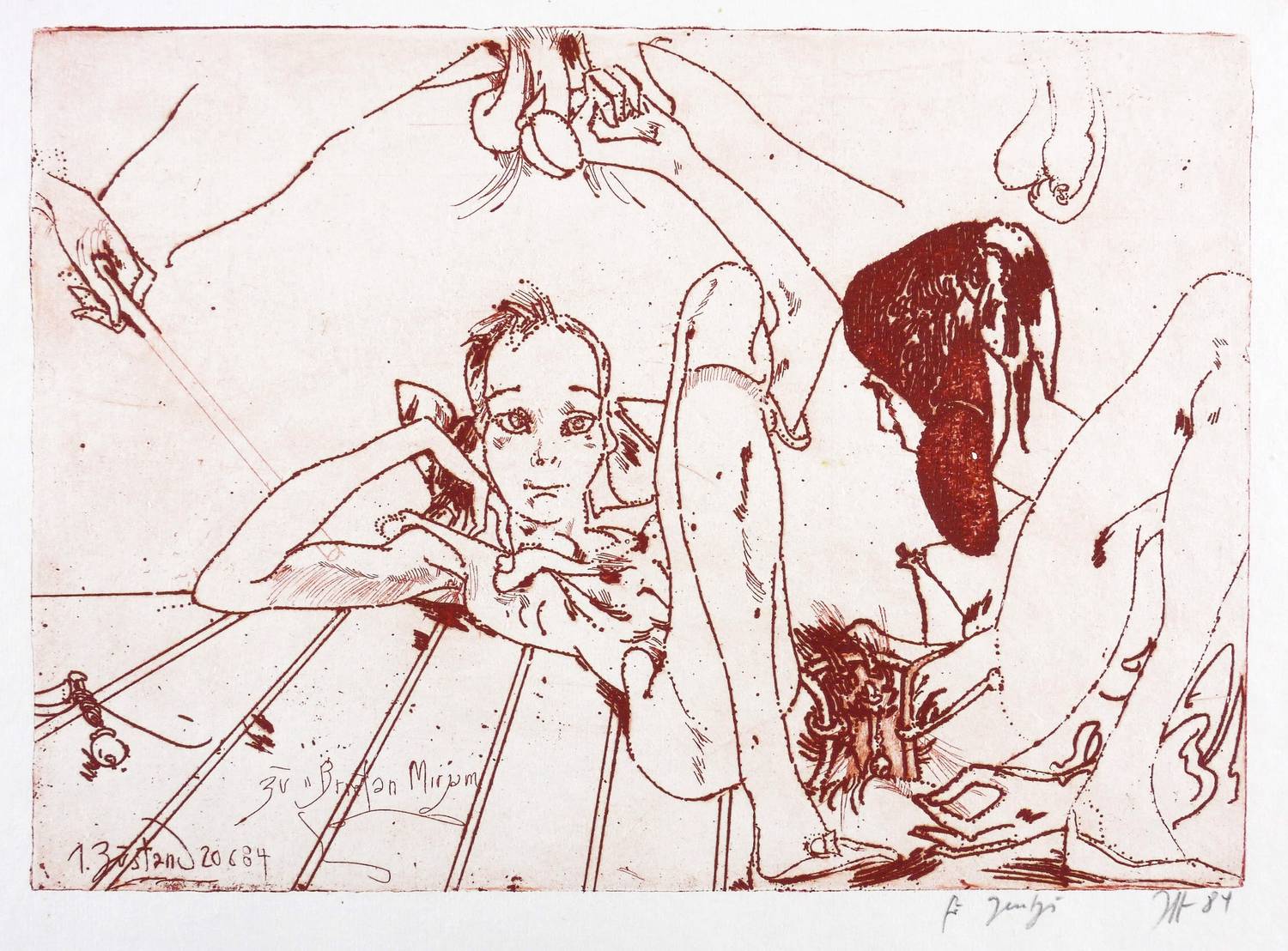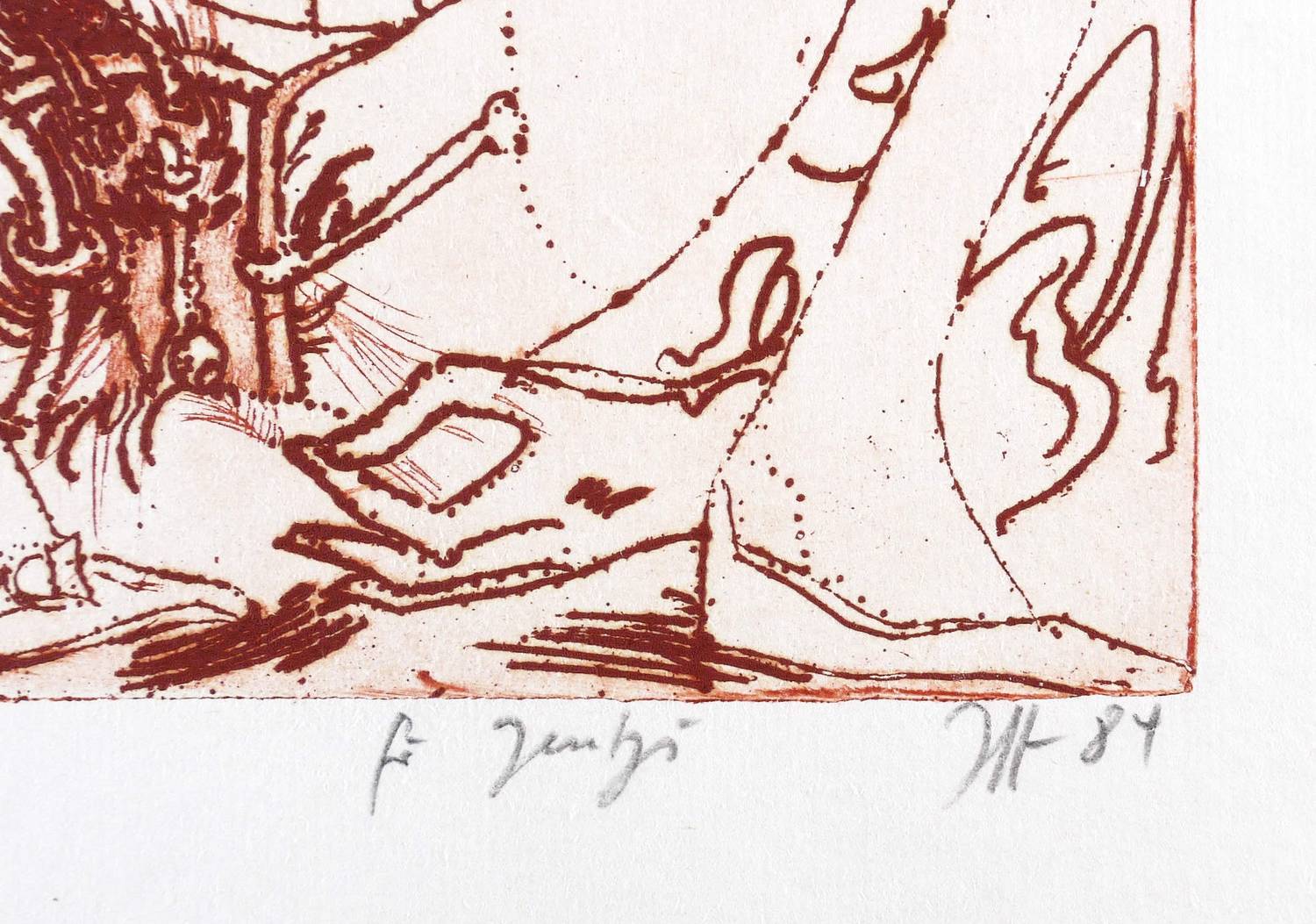 1984. Radierung / Strichätzung, Aquatinta & Kaltnadel, in Dunkelrot, auf feinstem hellgelbem Japan-Bütten. – Von Horst Janssen. – 20,6 x 29,0 cm (Darstellung / Platte), 25 x 34 cm (Blatt).