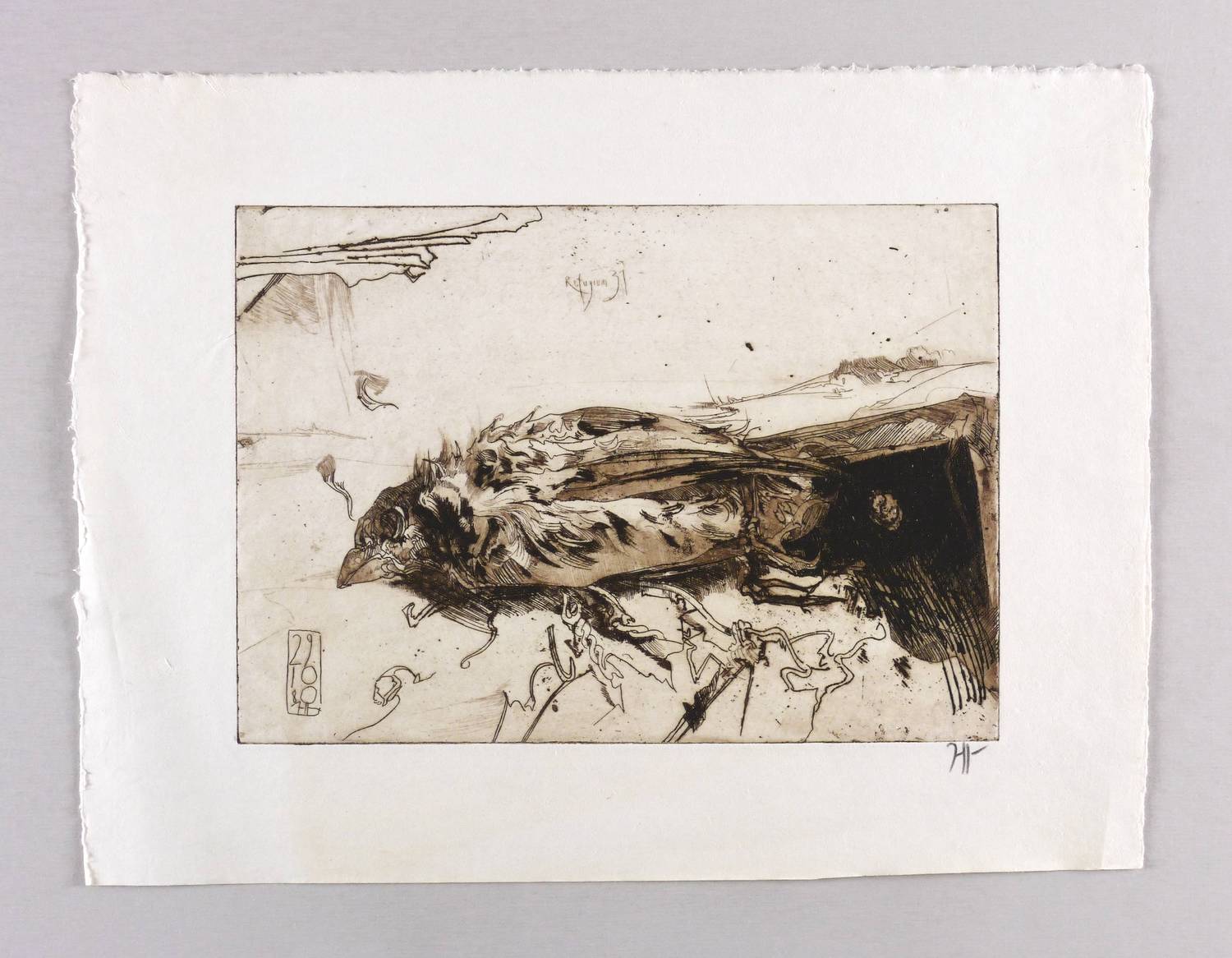 1980. Radierung / Strichätzung & Aquatinta, in rötlichem Schwarzbraun, auf rauem hellgelbem Japan. – Originale Künstlergrafik, von Horst Janssen. – 21,7 x 30,6 cm (Darstellung / Platte), 33 x 43 cm (Blatt).