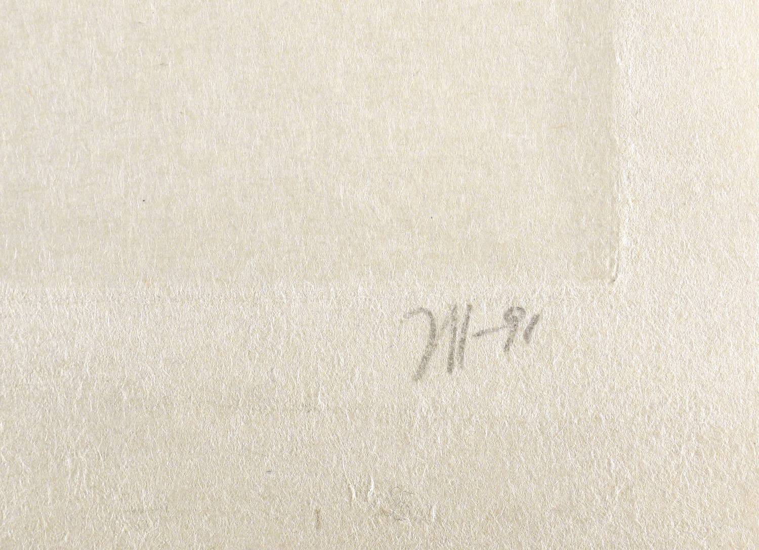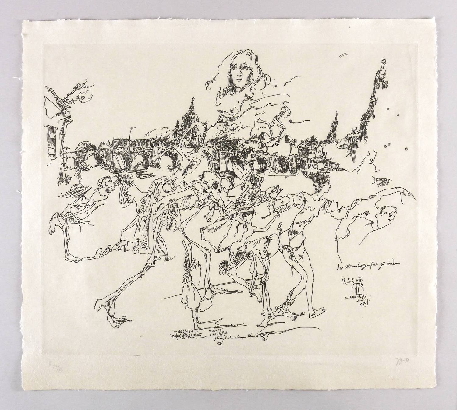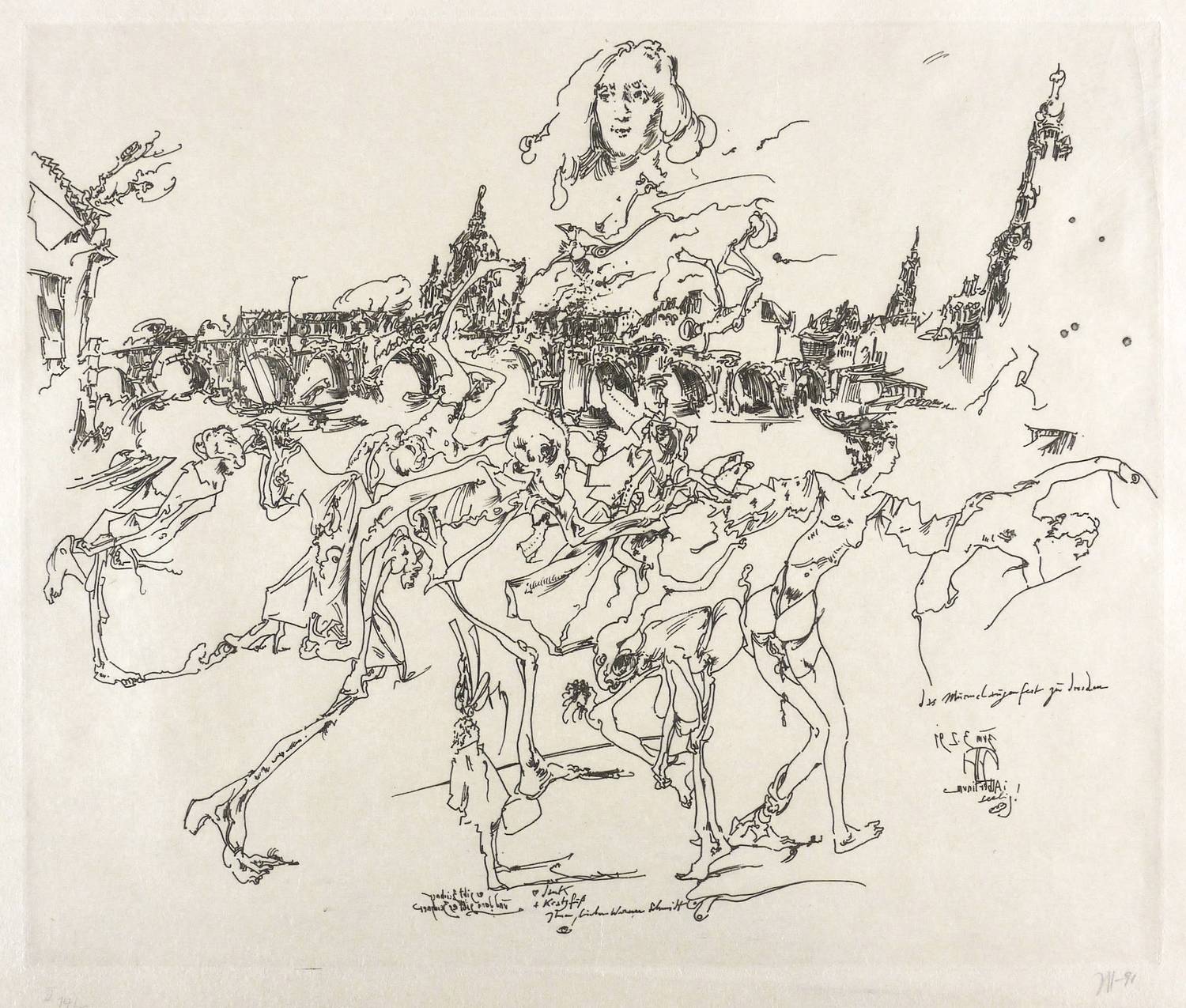 Rechts unten in Bleistift signiert und datiert: ″Janssen 91″. Links Auflagenbezeichnung: ″II 14/75″. In der Platte rechts unten monogrammiert, datiert, betitelt und bezeichnet: ″Albertinum seelig!″. In Spiegelschrift bezeichnet: ″Es gibt Zeichner und dann gibt es Zeichner″. Dazu Widmung an Werner Schmidt. – Totentanz-Motiv und Altstadt-Silhouette Dresdens werden zu einem Requiem auf die untergegangene und einem Dankgesang auf die wieder auferstandene Barockstadt. – Sehr schön erhalten. Tadelloser Zustand.