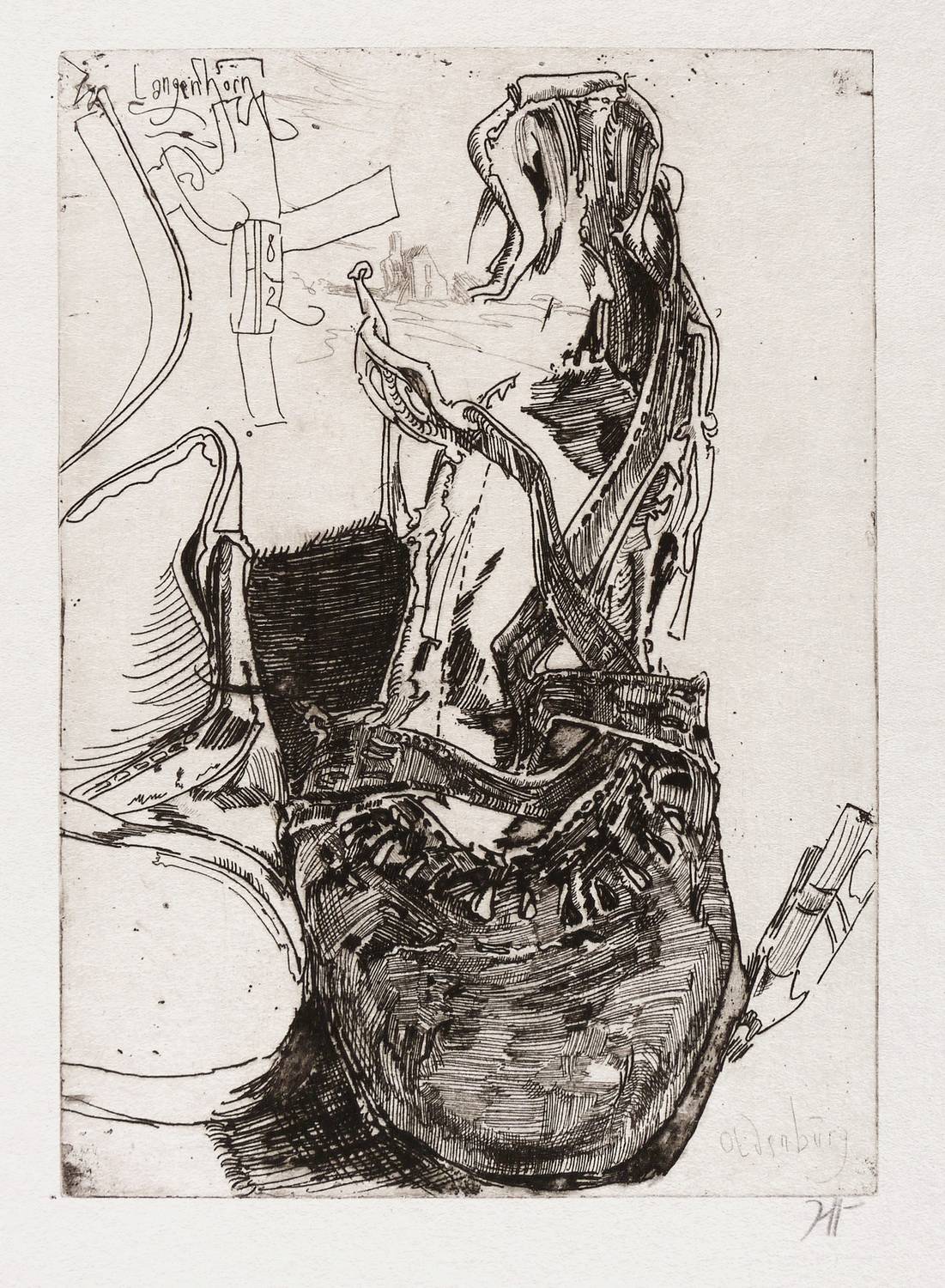 Kruglewsky 58. Griffelkunst 227 A4. – Rechts unten in Bleistift signiert: ″Janssen″. Links oben in der Platte monogrammiert und datiert sowie bezeichnet: ″Langenhorn / JH 82″. Rechts unten weitere Inschrift: ″Oldenburg″. – Edition der Griffelkunst. – Originalrandiges unbeschnittenes Blatt. Sehr guter Zustand.