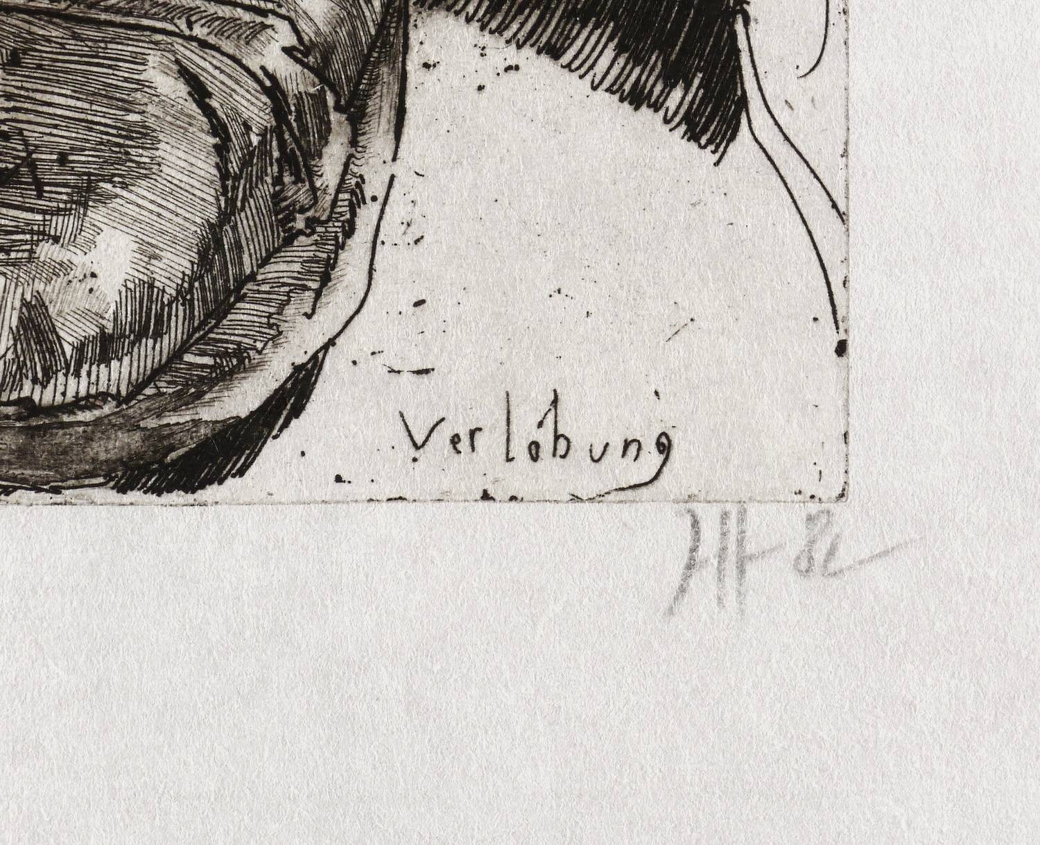 Kruglewsky 64. Griffelkunst 228 C4. – Rechts unten in Bleistift signiert und datiert: ″Janssen 82″. Links oben in der Platte monogrammiert, datiert und bezeichnet: ″JH 82 / Langenhorn″. Rechts unten Titel: ″Verlobung″. – Edition der Griffelkunst. – Originalrandiges unbeschnittenes Blatt. Sehr guter Zustand.