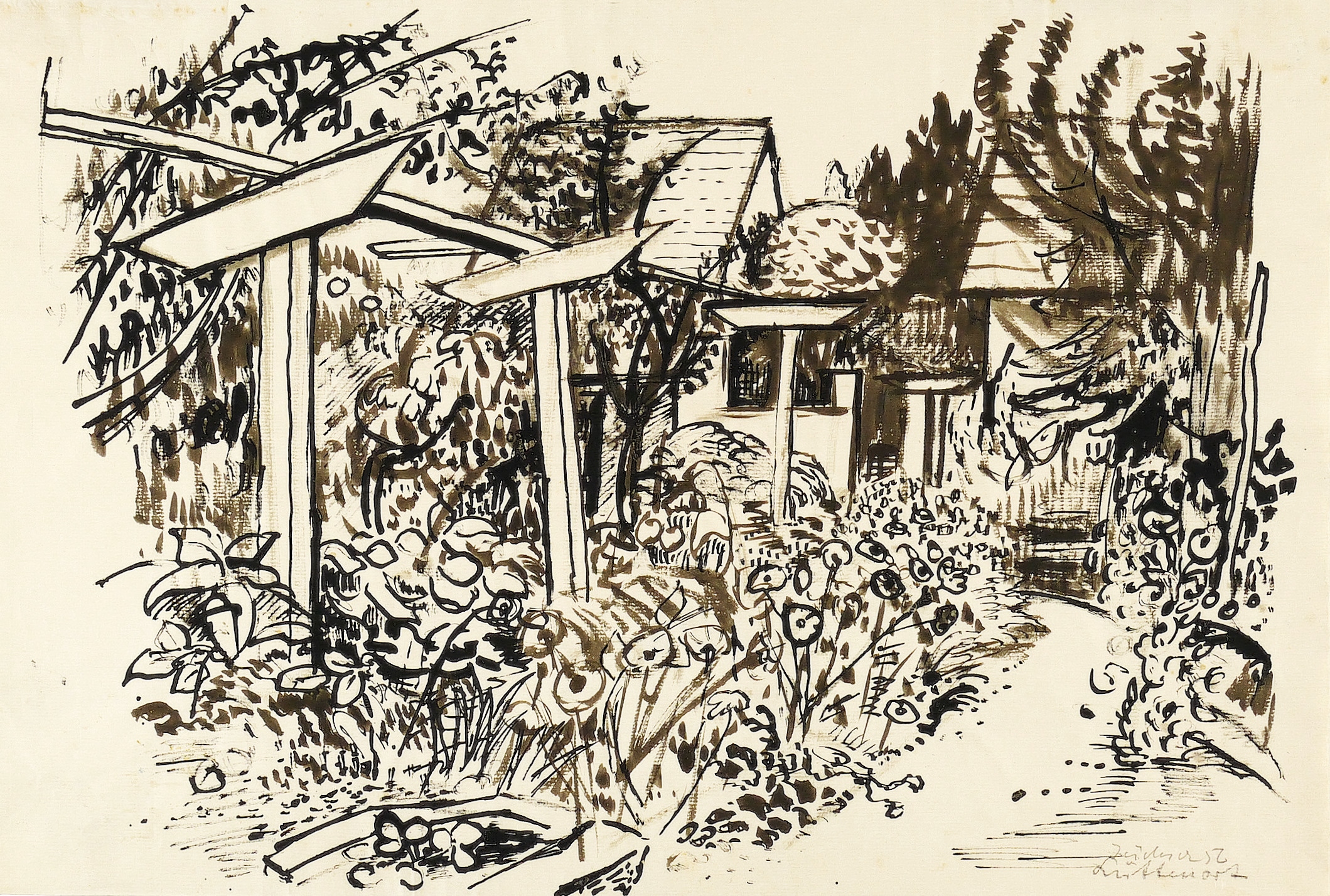 Rechts unten in Bleistift signiert und datiert. Dazu betitelt. Verso ebenfalls in Bleistift betitelt: ″Lüttenort / Garten″. – Lüttenort war der Rückzugs- und Arbeitsort von Otto Niemeyer-Holstein auf der Insel Usedom bei Koserow. – Im Passepartout montiert. Kaum merkliche Knickspuren im Rand. Insgesamt gut erhalten.