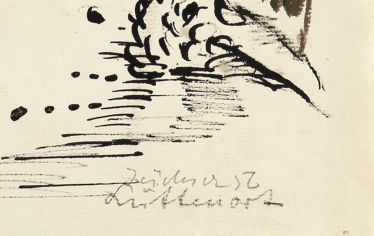 1952. Zeichnung / Pinselzeichnung, in grauer und schwarzer Tusche, auf hellgelbem Büttenpapier. – Originale Künstlergrafik, von Hans Jüchser. – Unikat. – 32,4 x 47,6 cm (Darstellung / Blatt), 50 x 70 cm (Passepartout).