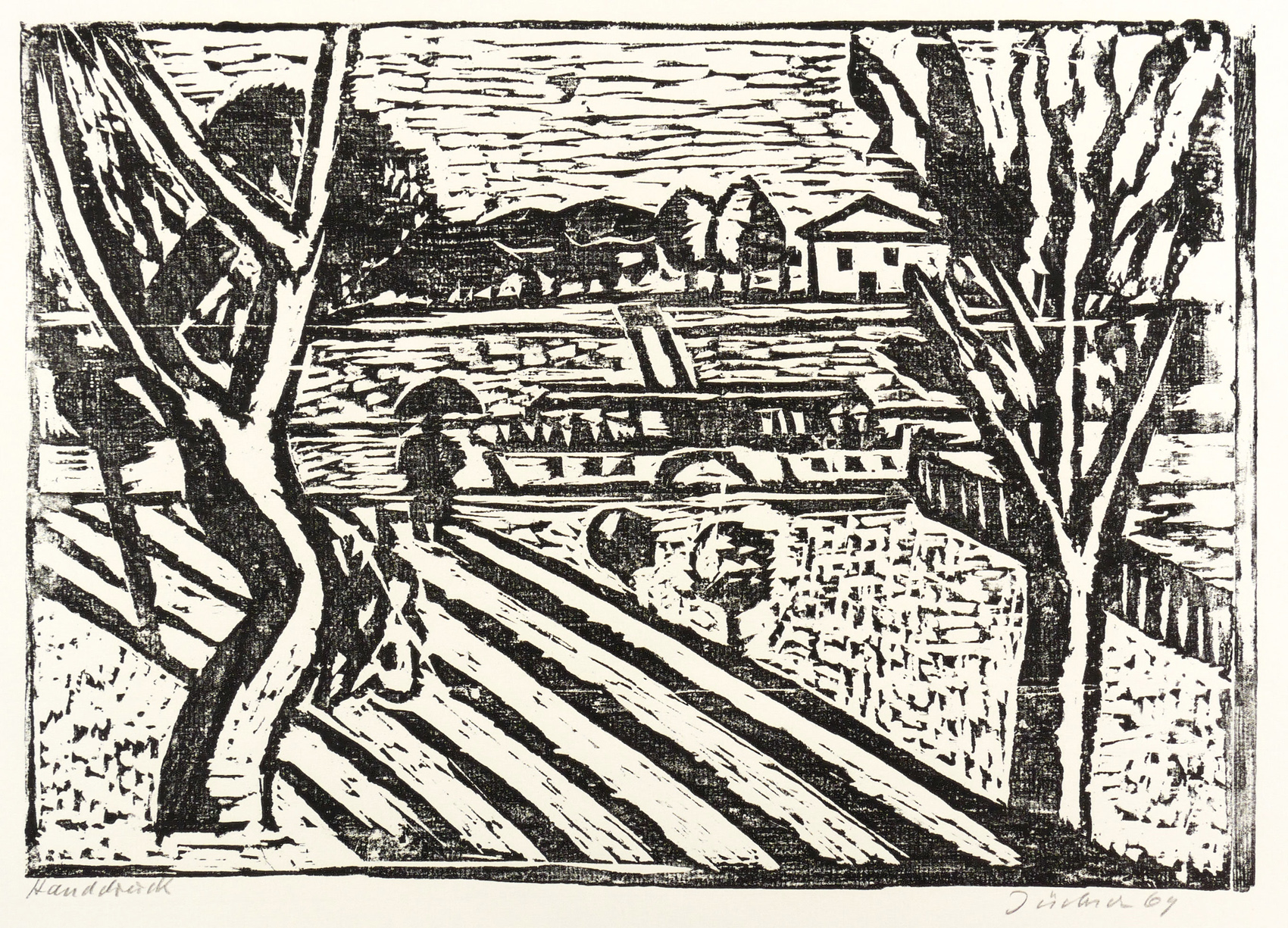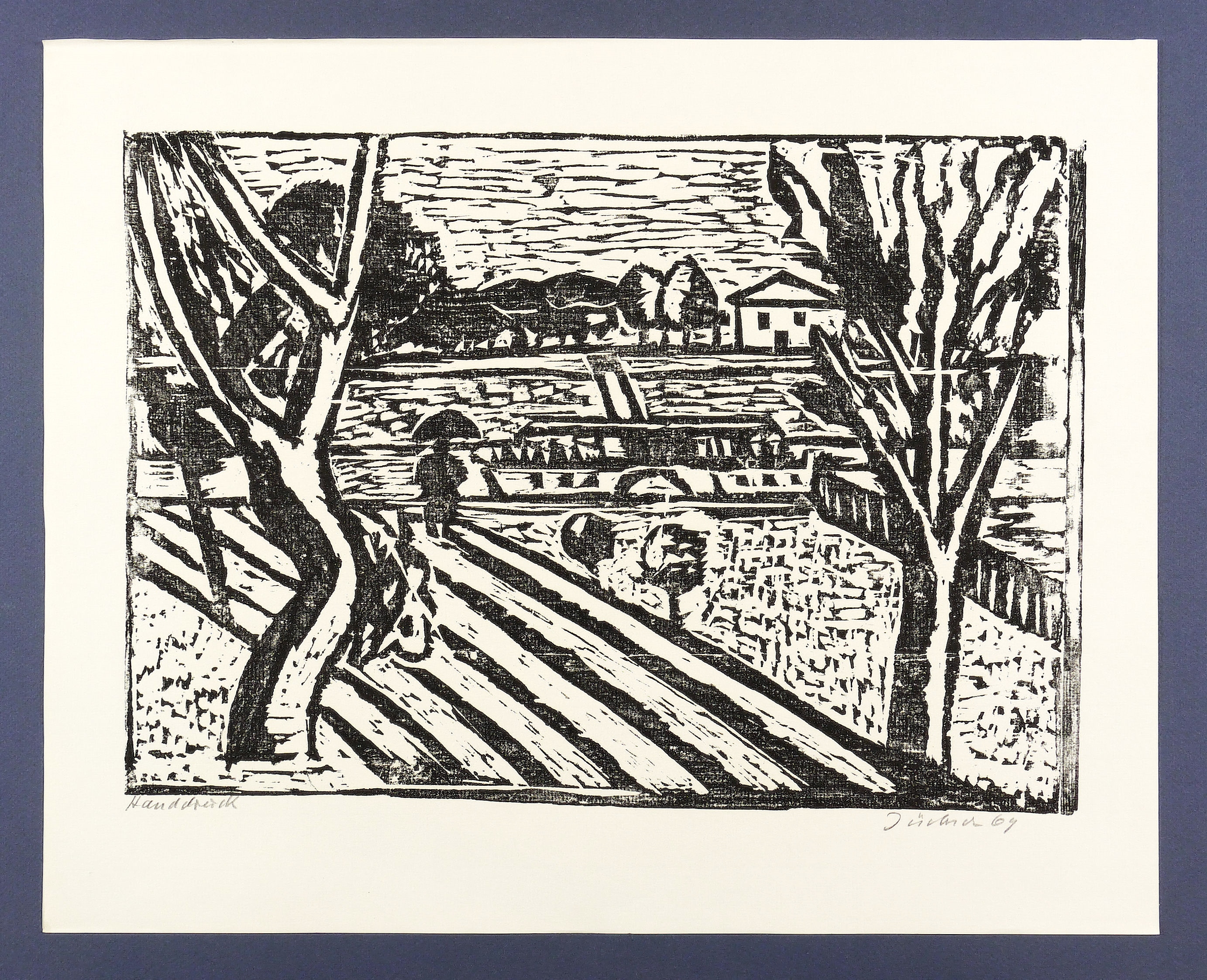 1969. Holzschnitt, in Schwarz, auf Achat-Büttenpapier. – Originale Künstlergrafik, von Hans Jüchser. – Auflage Exemplar Nr. 35/100. – 30,5 x 43,1 cm (Darstellung / Druckstock), 41 x 50 cm (Blatt).