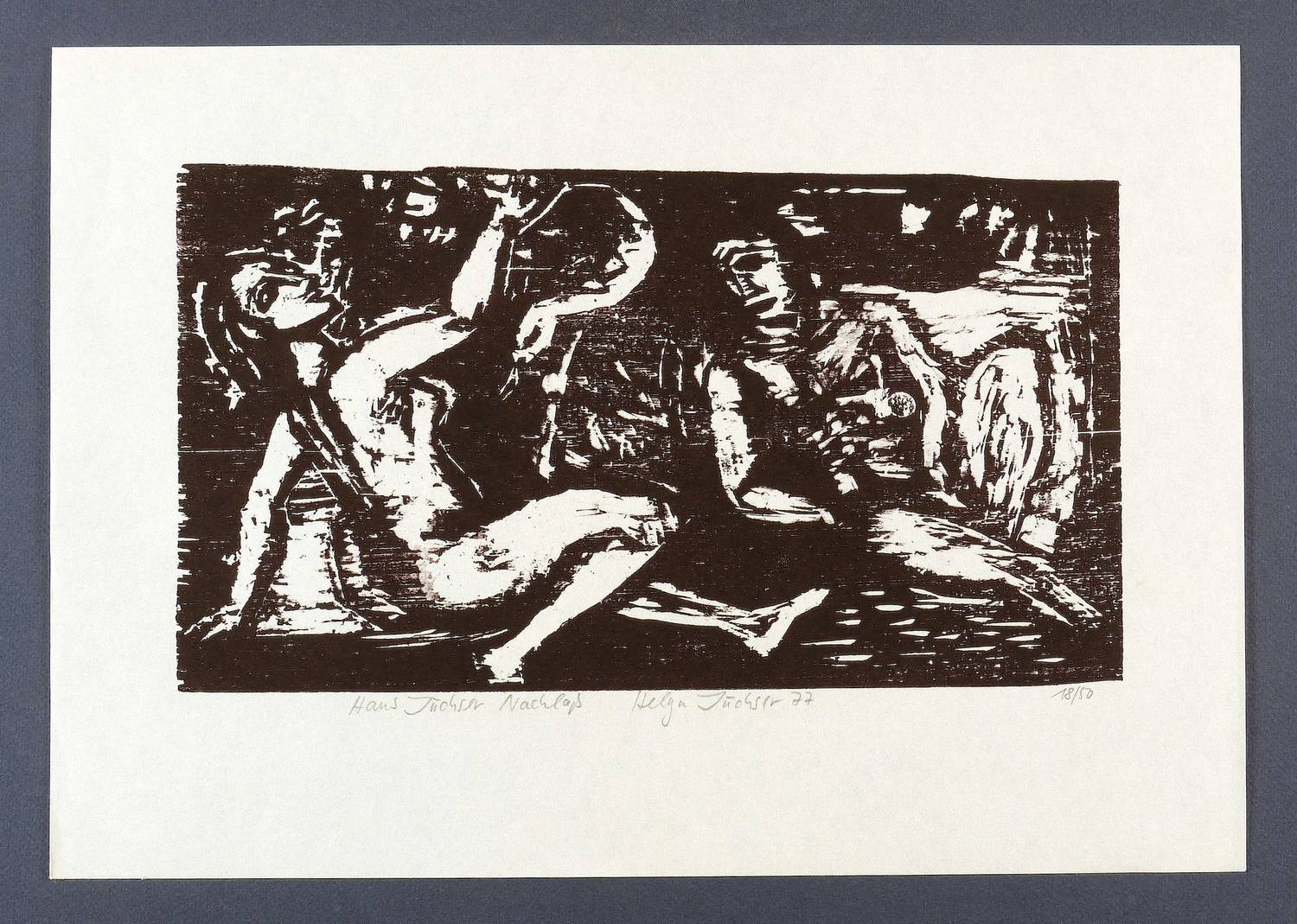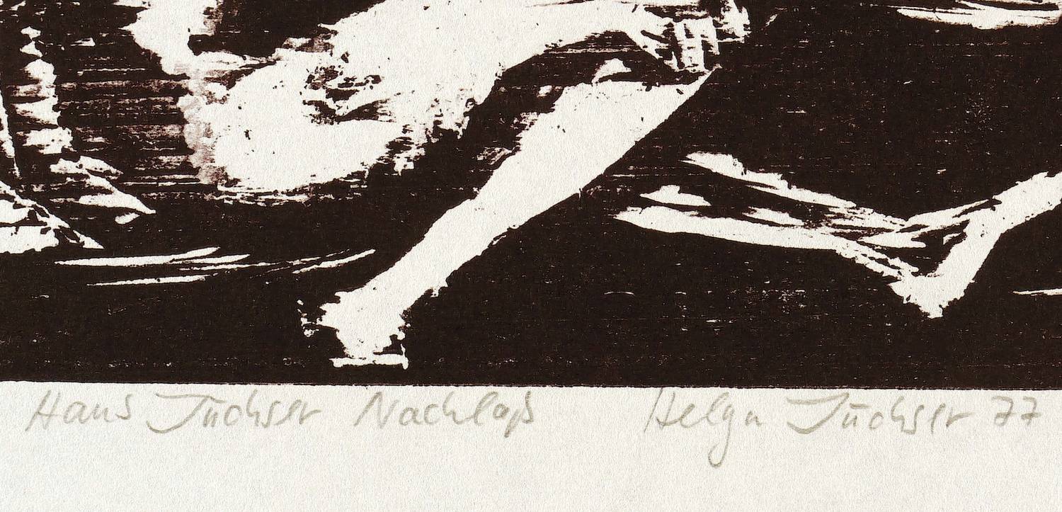 1974/1977. Holzschnitt, in Schwarz, auf rauem weißlichem Japanpapier. – Originale Künstlergrafik, von Hans Jüchser. – Auflage Exemplar Nr. 18/50. – 18,4 x 33,2 cm (Darstellung / Druckstock), 29,5 x 42 cm (Blatt).