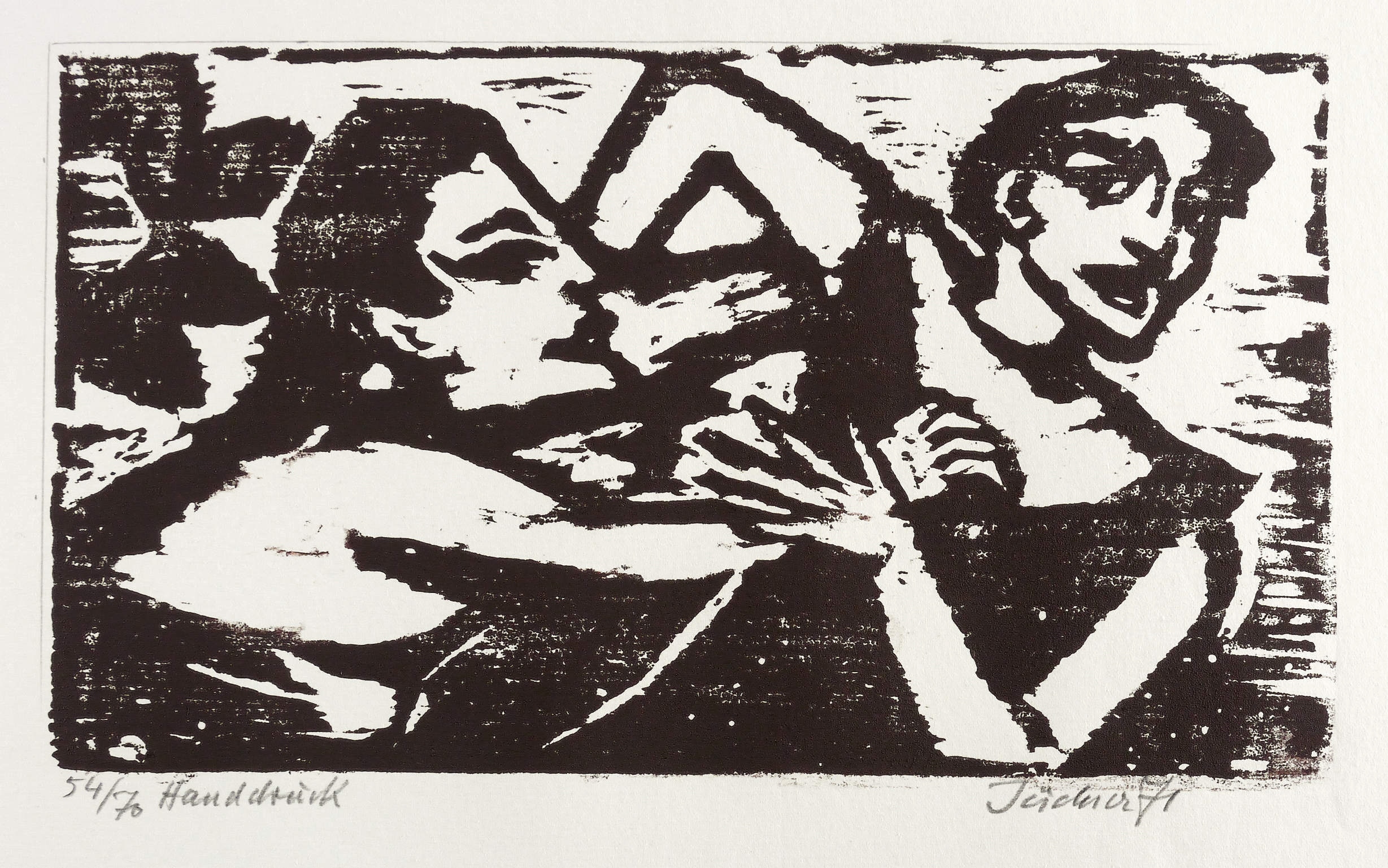 1971. Holzschnitt, in Schwarz, auf hellem Achat-Büttenpapier. – Originale Künstlergrafik, von Hans Jüchser. – Auflage Exemplar Nr. 54/70. – 16,1 x 27,5 cm (Darstellung / Druckstock), 31 x 42 cm (Blatt).