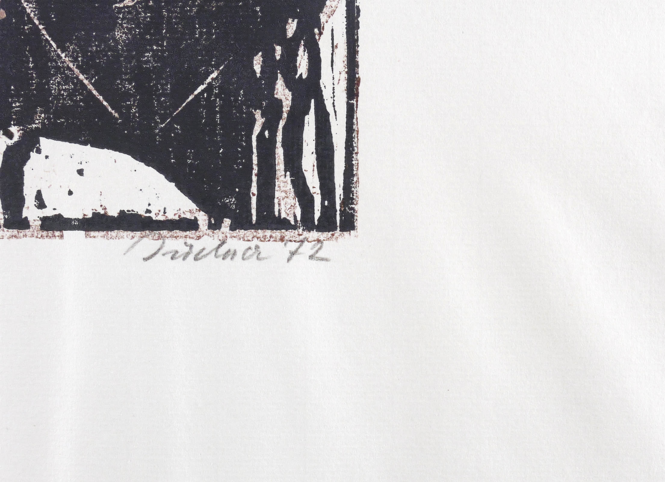 1972. Farbholzschnitt, in Hellbraun und Schwarz, auf hellem Achat-Maschinenbütten. – Originale Künstlergrafik, von Hans Jüchser. – Auflage Exemplar Nr. 54/100. – 45,4 x 19,3 cm (Darstellung / Druckstock), 63 x 50 cm (Blatt).