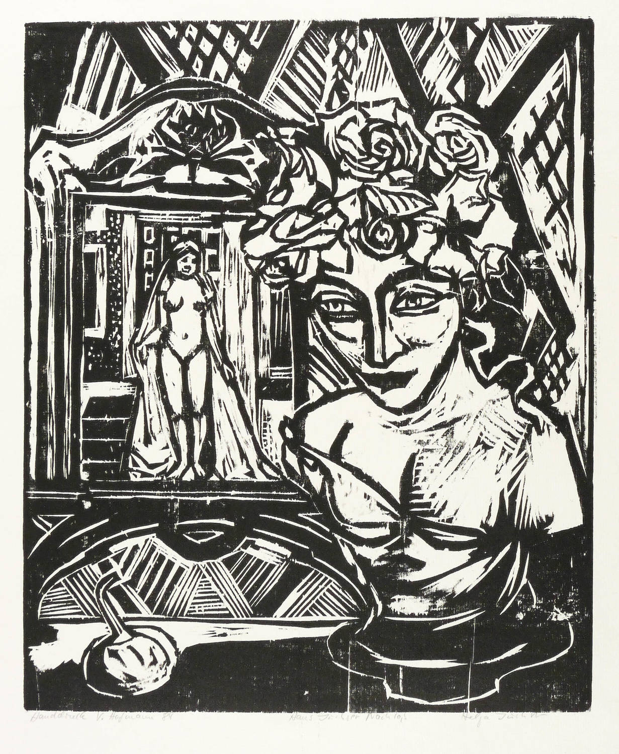 Rechts unten in Bleistift von der Witwe signiert: ″Helga Jüchser″. Links bezeichnet: ″Handdruck V. Hofmann 84″. Weiter: ″Hans Jüchser Nachlaß″. – Abzug vom originalen Holzstock durch den Dresdner Maler und Grafiker Veit Hofmann. – Sehr gut erhalten.