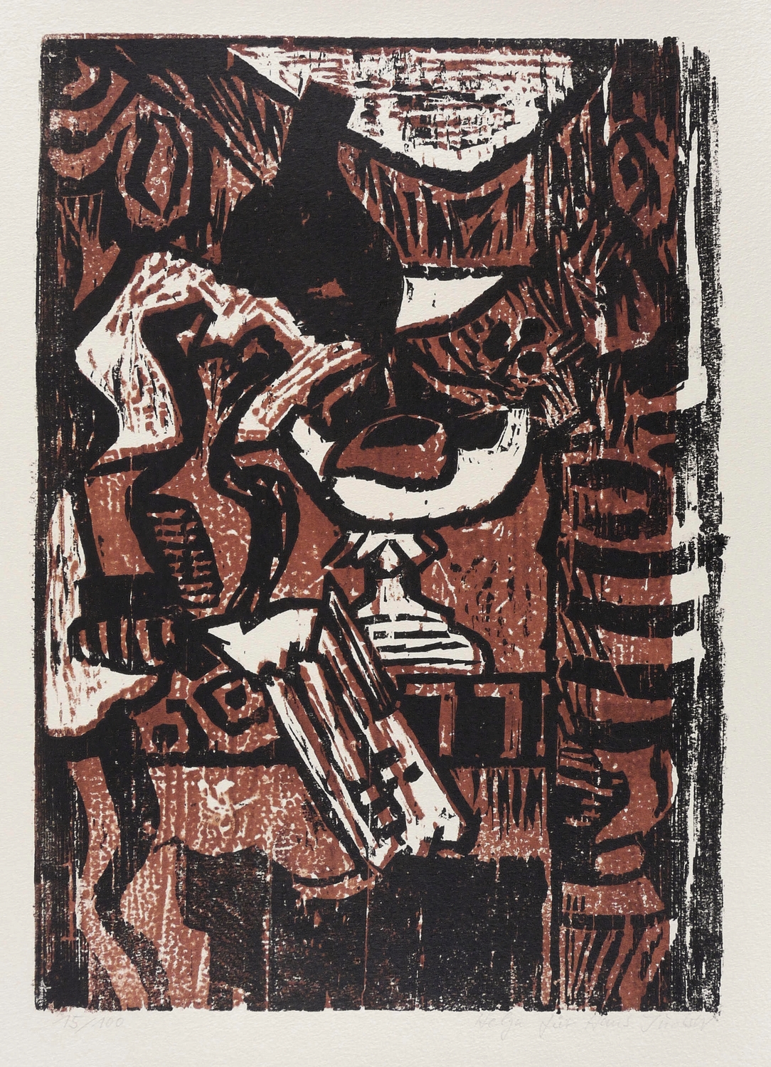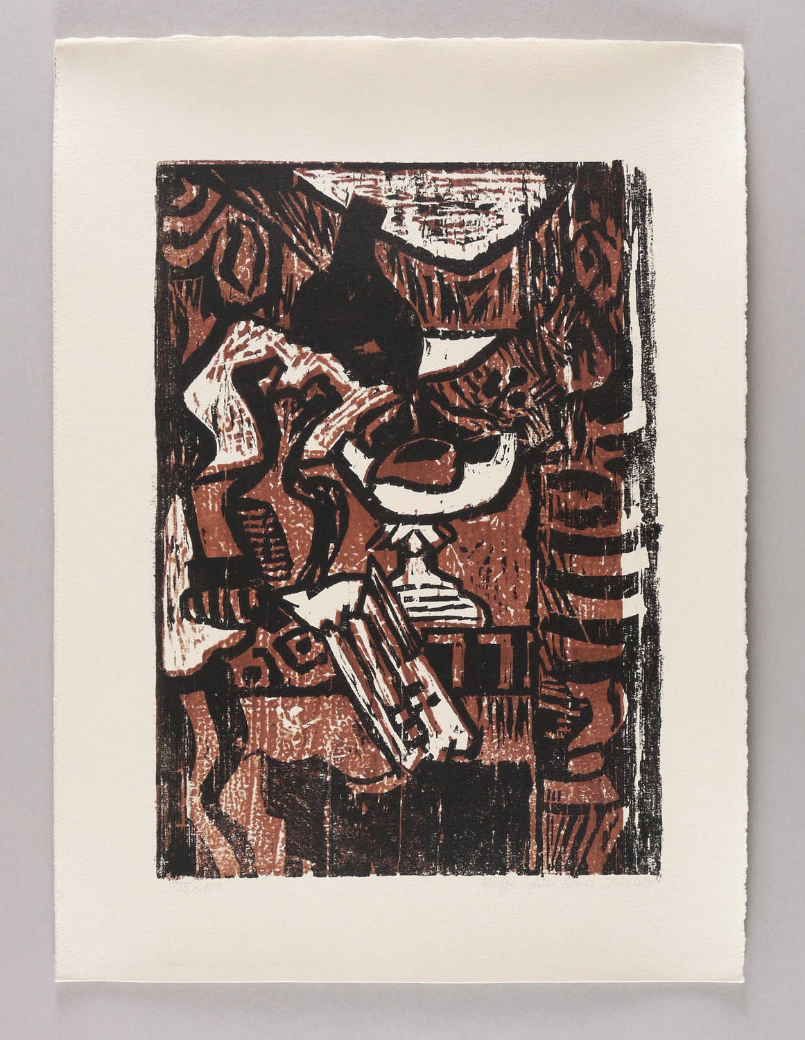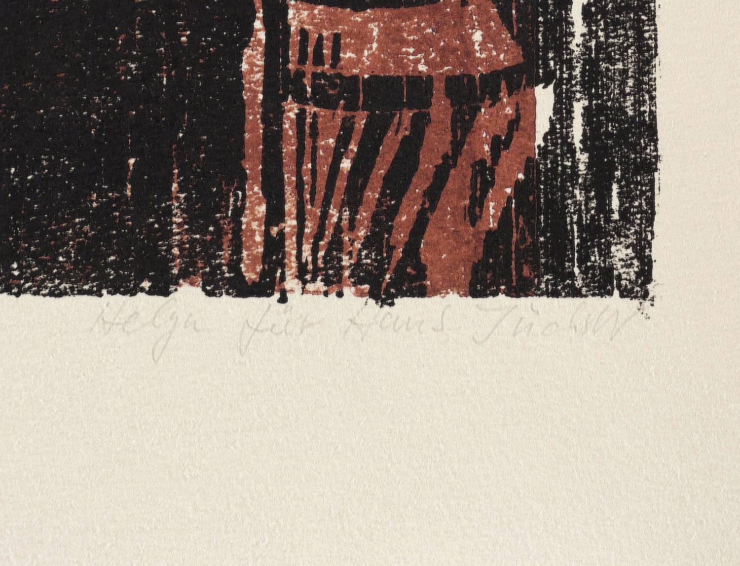 1969/1982. Farbholzschnitt, in Rotbraun &Schwarz, auf schwerem gelbem Bütten. – Originale Künstlergrafik, von Hans Jüchser. – Auflage Exemplar Nr. 15/100. – 41,2 x 29,1 cm (Darstellung / Druckstock), 54 x 40 cm (Blatt).
