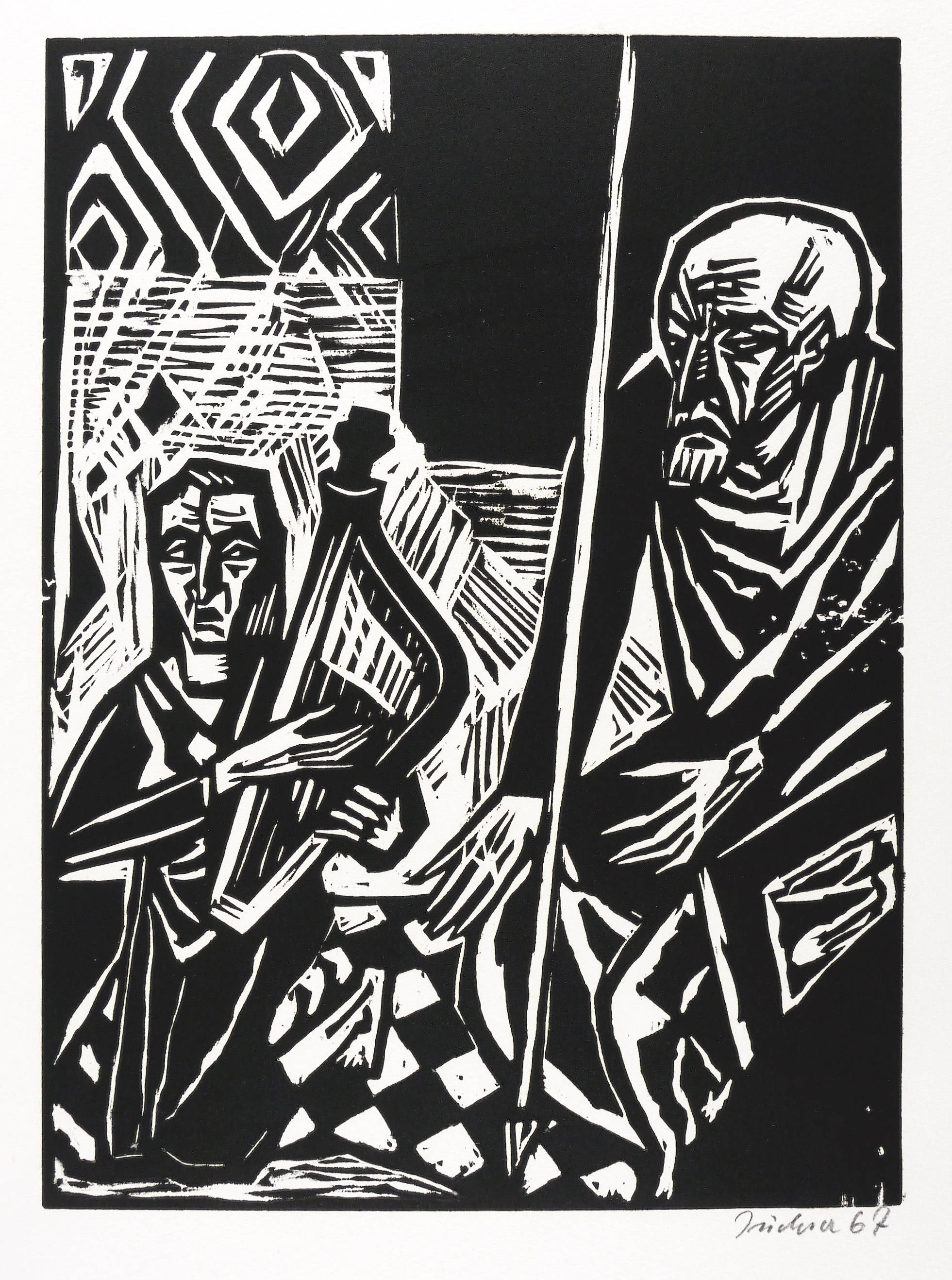 Rechts unten in Bleistift signiert und datiert: ″Jüchser 67″. Verso Auflagenbezeichnung. – Zur Bibelstelle: ″Des andern Tages geriet der böse Geist von Gott über Saul, und er raste daheim in seinem Hause; David aber spielte auf den Saiten mit seiner Hand, wie er täglich pflegte. Und Saul hatte einen Spieß in der Hand und er schoß ihn und gedachte: Ich will David an die Wand spießen. David aber wandte sich zweimal von ihm.″ (1. Samuel 18:10-11). – Tadelloses Exemplar. Sehr guter Zustand.