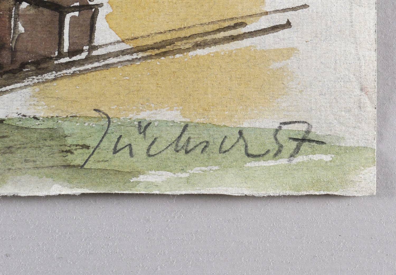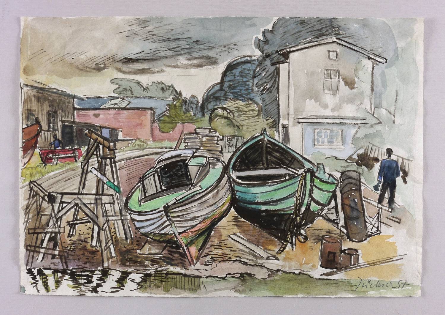 1957. Aquarell, auf rauem hellgrau getöntem Hahnemühle. – Originale Künstlergrafik, von Hans Jüchser. – Unikat. – 31,3 x 45,1 cm (Darstellung / Blatt).