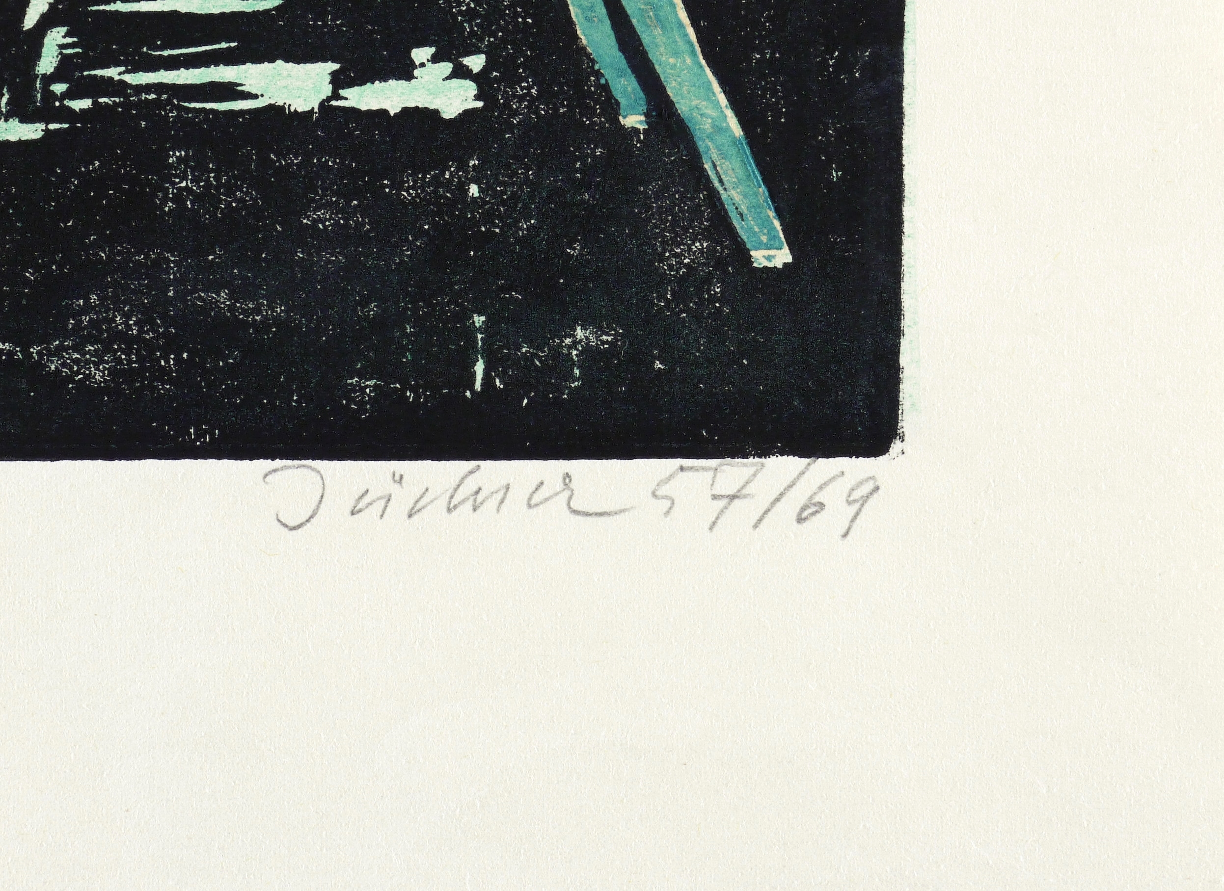 Rechts unten in Bleistift signiert und datiert: ″Jüchser 57/69″. Links bezeichnet und nummeriert: ″Handdruck 7/8″. – Sehr guter Zustand.