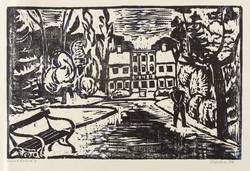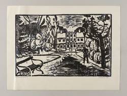 1970. Holzschnitt, in Schwarz, auf gelblichem Maschinenbütten. – Originale Künstlergrafik, von Hans Jüchser. – Auflage Exemplar Nr. 3. – 28,1 x 42,8 cm (Darstellung / Druckstock), 38 x 51 cm (Blatt).