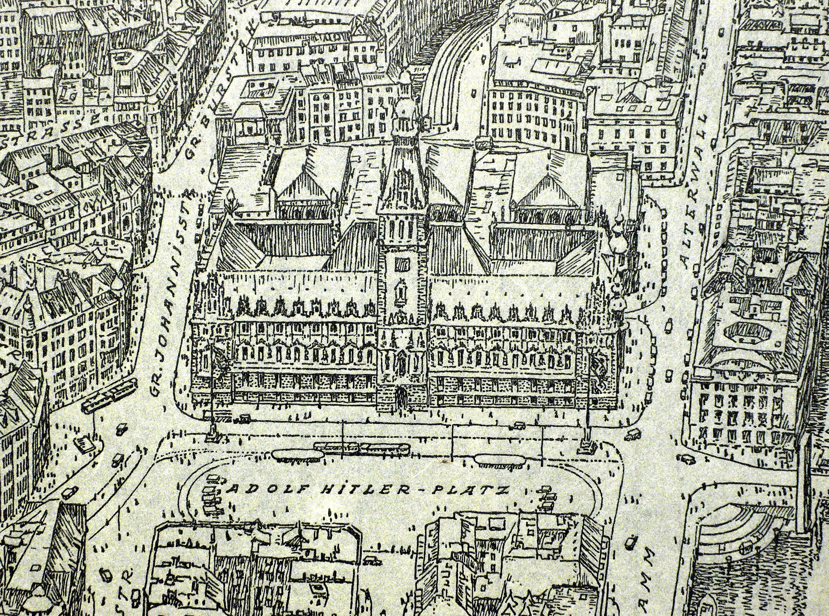 Im Stein in der Darstellung links unten signiert sowie am unteren Rand betitelt. – Am 19. April 1933 wurde der Rathausmarkt in Adolf-Hitler-Platz umbenannt. Die Rückbenennung erfolgte nach Kriegsende 1945. – Tadellos erhalten.