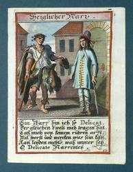 Aus: Abraham a Sancta Clara, Centi-Folium Stultorum In Quarto Oder Hundert Ausbündige Narren, In Folio (Nürnberg / Wien: Weigel / Lercher 1709). – Oberhalb der Darstellung betitelt. Darunter die deutschen Verse: ″Ein Narr bin ich so Delicat, / Der gleichen d'welt nieh tragen hat, / Laß von keinem rühren an, / Mit wortt und wercken wies sein kan, /...″ – Die 65 enthaltenen Kupfertafeln des ″Centi- folium stultorum″ sind ursprünglich 1690 für das Werk ″Ein Schock Phantastn in einem Kasten″ von Christoph Weigel gestochen worden. - Emblematische Darstellung eines vornehmen Herren, der sich pikiert von einem Bettler abwendet. – Verso Reste alter Montierung, sonst dem Alter entsprechend guter Zustand.