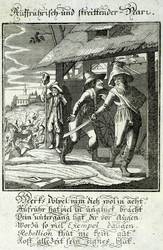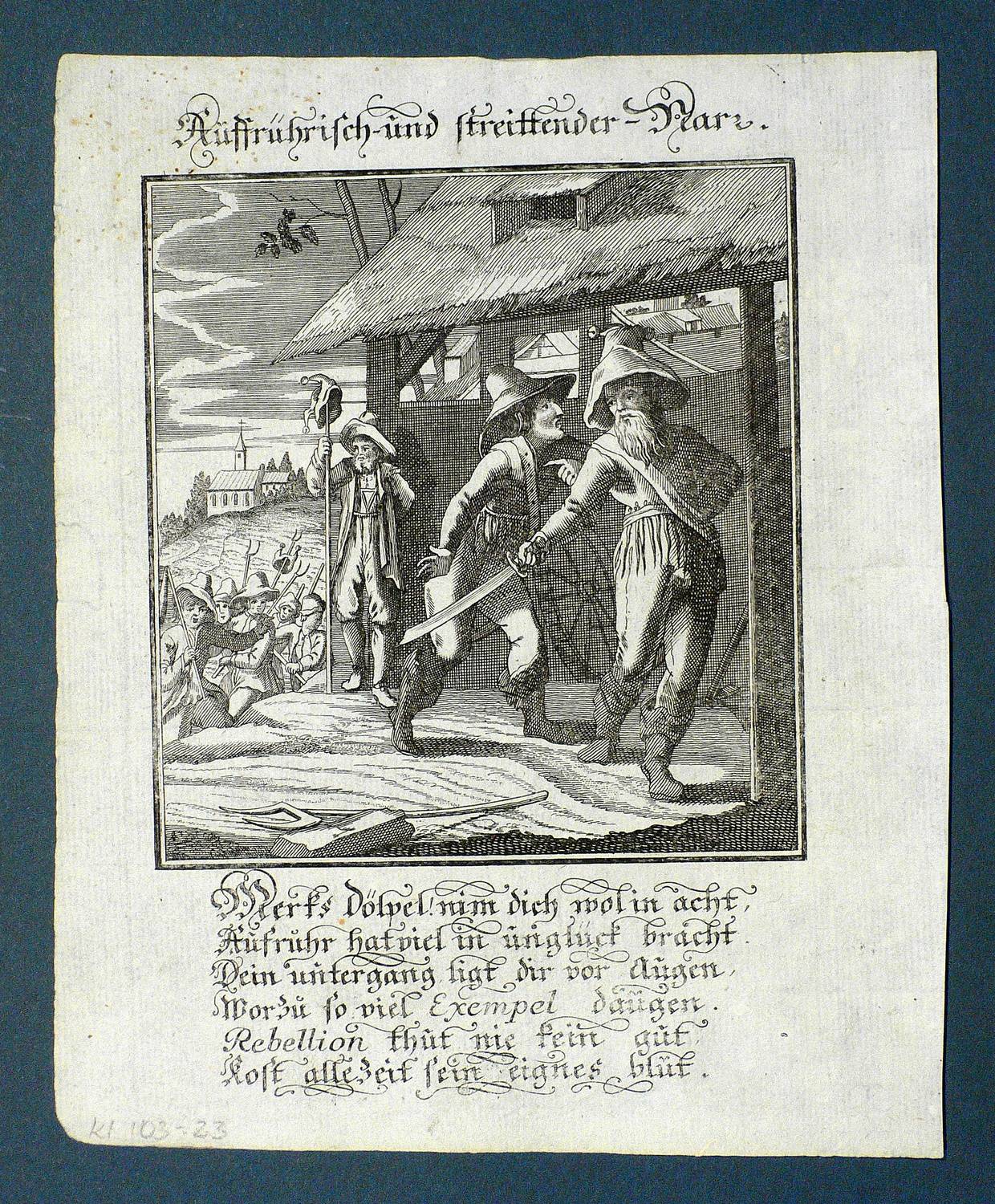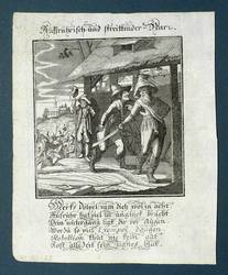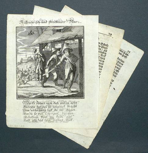 Aus: Abraham a Sancta Clara, Centi-Folium Stultorum In Quarto Oder Hundert Ausbündige Narren, In Folio (Nürnberg / Wien: Weigel / Lercher 1709). – Oberhalb der Darstellung betitelt. Darunter die Verse: ″Merks dölpel! nim dich wol in acht, / Aufruhr hat viel in unglück bracht. / Dein untergang ligt dir vor augen, / Worzu so viel Exempel daugen. / Rebellion thut nie kein gut, / kost alle Zeit sein eignes blut.″ – Die 65 enthaltenen Kupfertafeln des ″Centi- folium stultorum″ sind ursprünglich 1690 für das Werk ″Ein Schock Phantastn in einem Kasten″ von Christoph Weigel gestochen worden. - Emblematische Darstellung eines bewaffneten Aufrührers und der aufgebrachten Menge im Hintergrund. – Partiell marginal fleckig und wellig. Ein Textblatt mit wenigen kleinen Wurmlöchern, sonst dem Alter entsprechend guter Zustand.