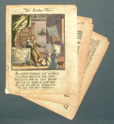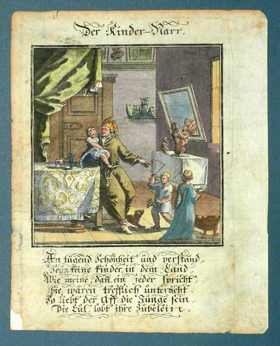 Aus: Abraham a Sancta Clara, Centi-Folium Stultorum In Quarto Oder Hundert Ausbündige Narren, In Folio (Nürnberg / Wien: Weigel / Lercher 1709). – Oberhalb der Darstellung betitelt. Darunter die deutschen Verse: ″An tugend, Schönheit und verstand, Seyn keine Kinder, in dem Land, Wie meine; dan[n], en jeder spricht, sie wären trefflich unterricht. So liebt der Aff, die Junge sein, Die Eul, lobt ihre Zübelein.″ – Die 65 enthaltenen Kupfertafeln des ″Centi- folium stultorum″ sind ursprünglich 1690 für das Werk ″Ein Schock Phantastn in einem Kasten″ von Christoph Weigel gestochen worden. - Mit zwei Blatt Text. – Papier dem Alter entsprechend gebräunt. Im Randbereich partiell fleckig und angeschmutzt. Teilweise Eckabrisse und randrissig. Eher mäßiger Zustand..