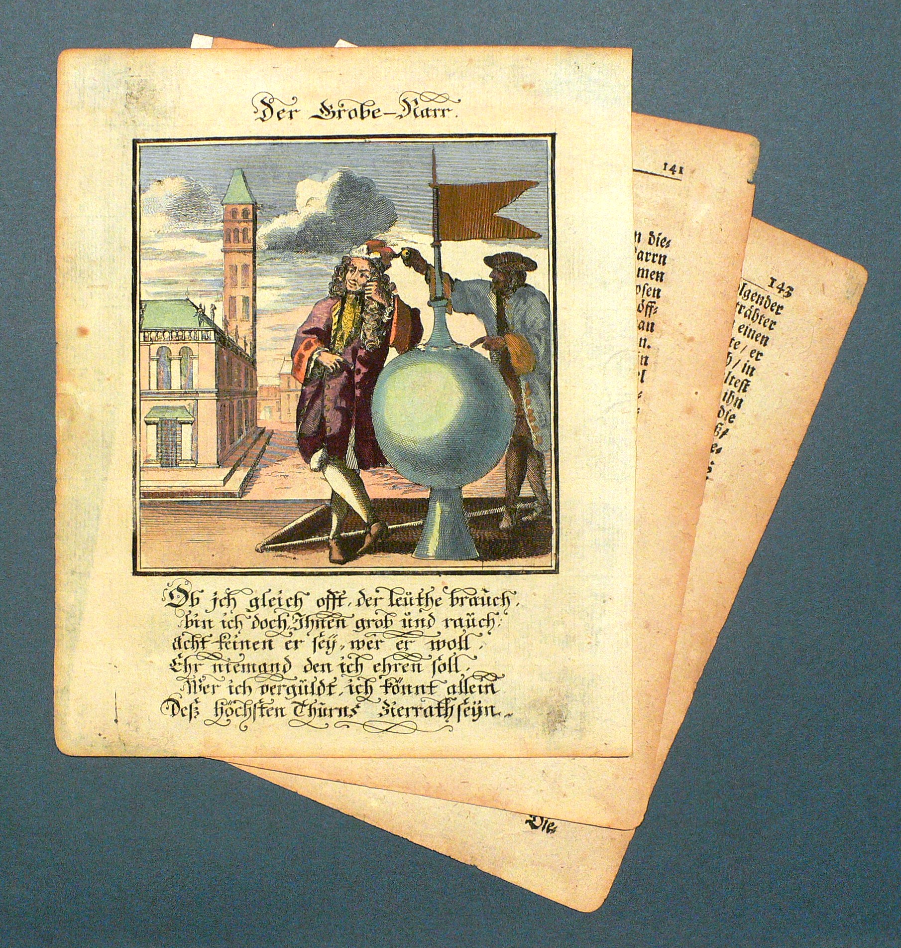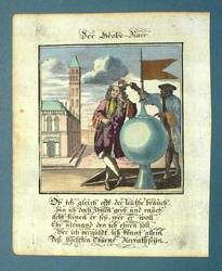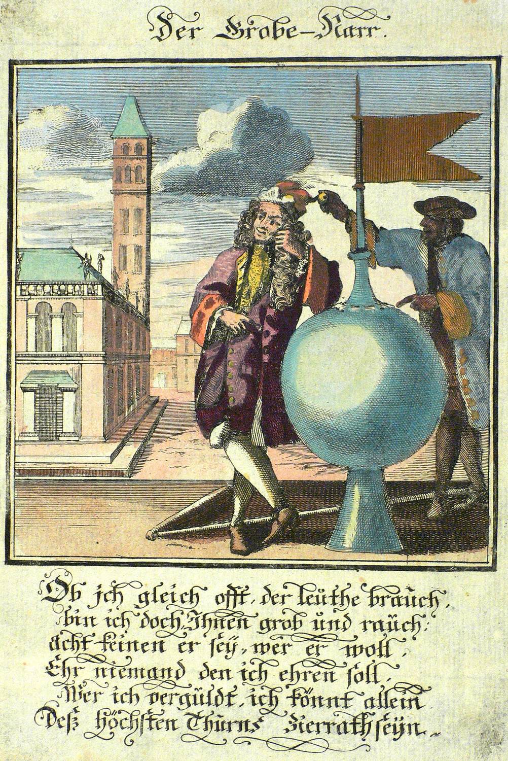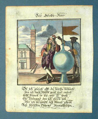 Aus: Abraham a Sancta Clara, Centi-Folium Stultorum In Quarto Oder Hundert Ausbündige Narren, In Folio (Nürnberg / Wien: Weigel / Lercher 1709). – Oberhalb der Darstellung betitelt. Darunter die Verse: ″Ob ich gleich offt, der leuthe brauch, / bin ich doch Ihnen grob und rauch: / acht keinen er sey, wer er woll, / Ehr niemand den ich ehren soll, / Wer ich verguldt, ich könnt allein / Deß höchsten Thurns Zierrath seyn.″ – Die 65 enthaltenen Kupfertafeln des ″Centi- folium stultorum″ sind ursprünglich 1690 für das Werk ″Ein Schock Phantastn in einem Kasten″ von Christoph Weigel gestochen worden. - Mit zwei Blatt Text. – Papier dem Alter entsprechend leicht, Textblätter etwas stärker gebräunt, partiell auch etwas fleckig. Textblätter mit Resten alter Montierung bzw. eines mit Eckausriss. Die Darstellung selber in noch gutem Zustand.