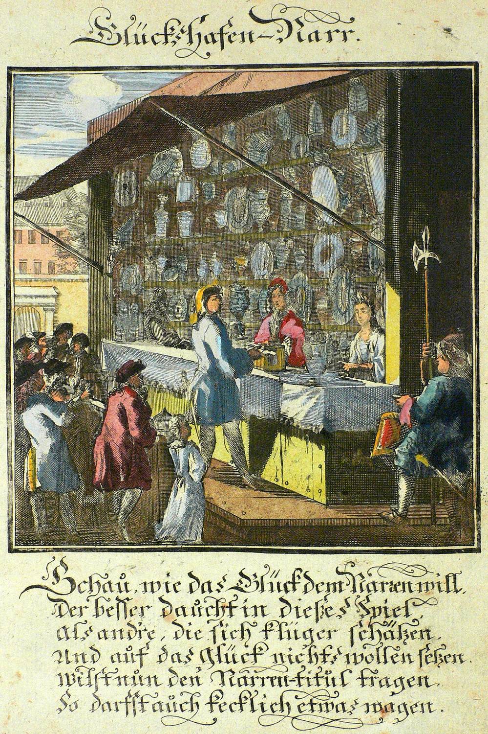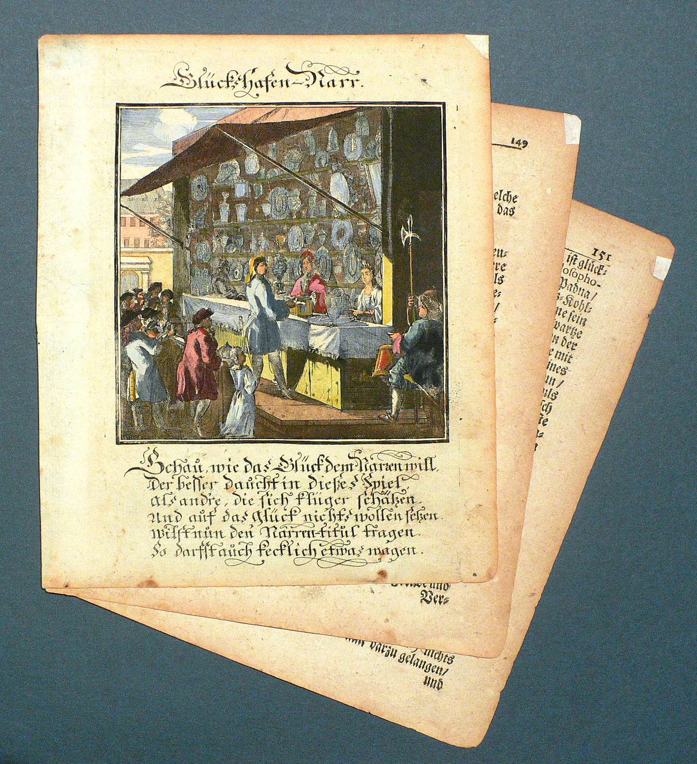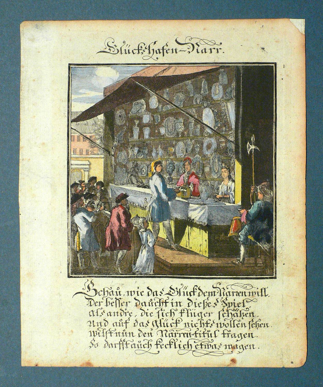 Aus: Abraham a Sancta Clara, Centi-Folium Stultorum In Quarto Oder Hundert Ausbündige Narren, In Folio (Nürnberg / Wien: Weigel / Lercher 1709). – Oberhalb der Darstellung betitelt. Darunter die deutschen Verse: ″Schau, wie das Glück dem Narren will,Der besser daucht in dießes Spiel, als andre, die sich klüger schätzen. Und auf das Glück nichts wollen setzen. Wilst nun den Narren-titul tragen, So darfst auch kecklich etwas wagen.″ – Die 65 enthaltenen Kupfertafeln des ″Centi- folium stultorum″ sind ursprünglich 1690 für das Werk ″Ein Schock Phantastn in einem Kasten″ von Christoph Weigel gestochen worden. - Mit zwei Textblättern. – Papier dem Alter entsprechend leicht gebräunt und partiell schwach fleckig. In den oberen Ecken Reste alter Montierung. Ingesamt noch guter Zustand.