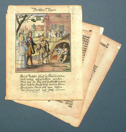 Aus: Abraham a Sancta Clara, Centi-Folium Stultorum In Quarto Oder Hundert Ausbündige Narren, In Folio (Nürnberg / Wien: Weigel / Lercher 1709). – Oberhalb der Darstellung betitelt. Darunter die Verse: ″Auch Bettler seind in Narrn-Orden, / Noch willig aufgenom[m]en worden, / Weil viel zu Tag sich presthafft nen[n]en, / Und doch zu Nacht braf dantzen kön[n]en. / Dergleichen Narrn solt man führen, / Zur Arbeit, und mit Stöß curiren.″ – Die 65 enthaltenen Kupfertafeln des ″Centi- folium stultorum″ sind ursprünglich 1690 für das Werk ″Ein Schock Phantastn in einem Kasten″ von Christoph Weigel gestochen worden. - Mit zwei Blatt Text. – Papier dem Alter entsprechend leicht gebräunt. In den oberen Ecken Reste alter Montierung. Insgesamt noch guter Zustand.