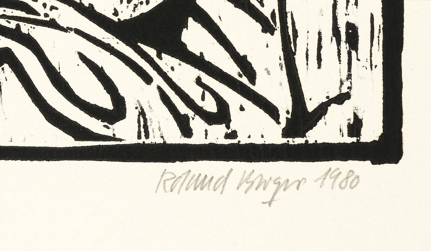 1980. Holzschnitt, in Schwarz, auf hellchamois Papier. – Originale Künstlergrafik, von Roland R. Berger. – 30,4 x 30,7 cm (Darstellung), 60 x 42 cm (Blatt).