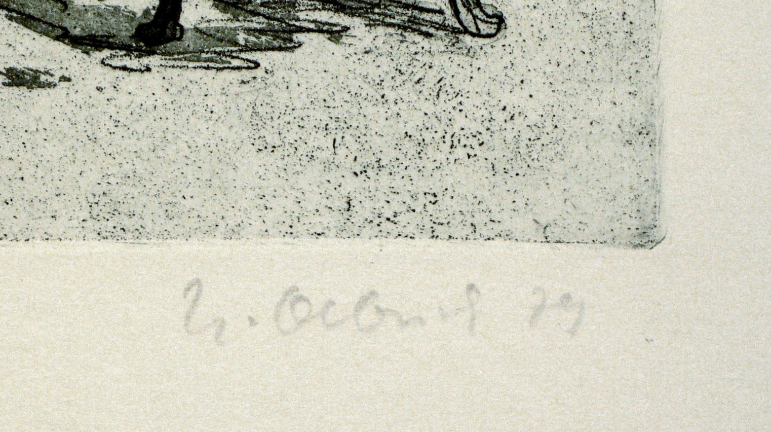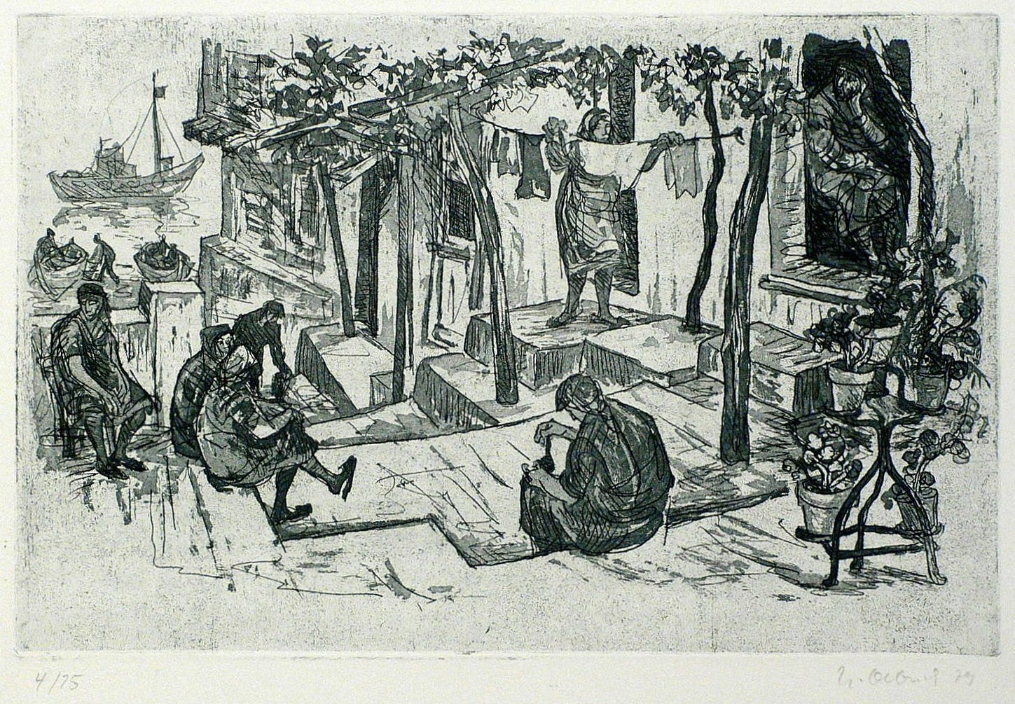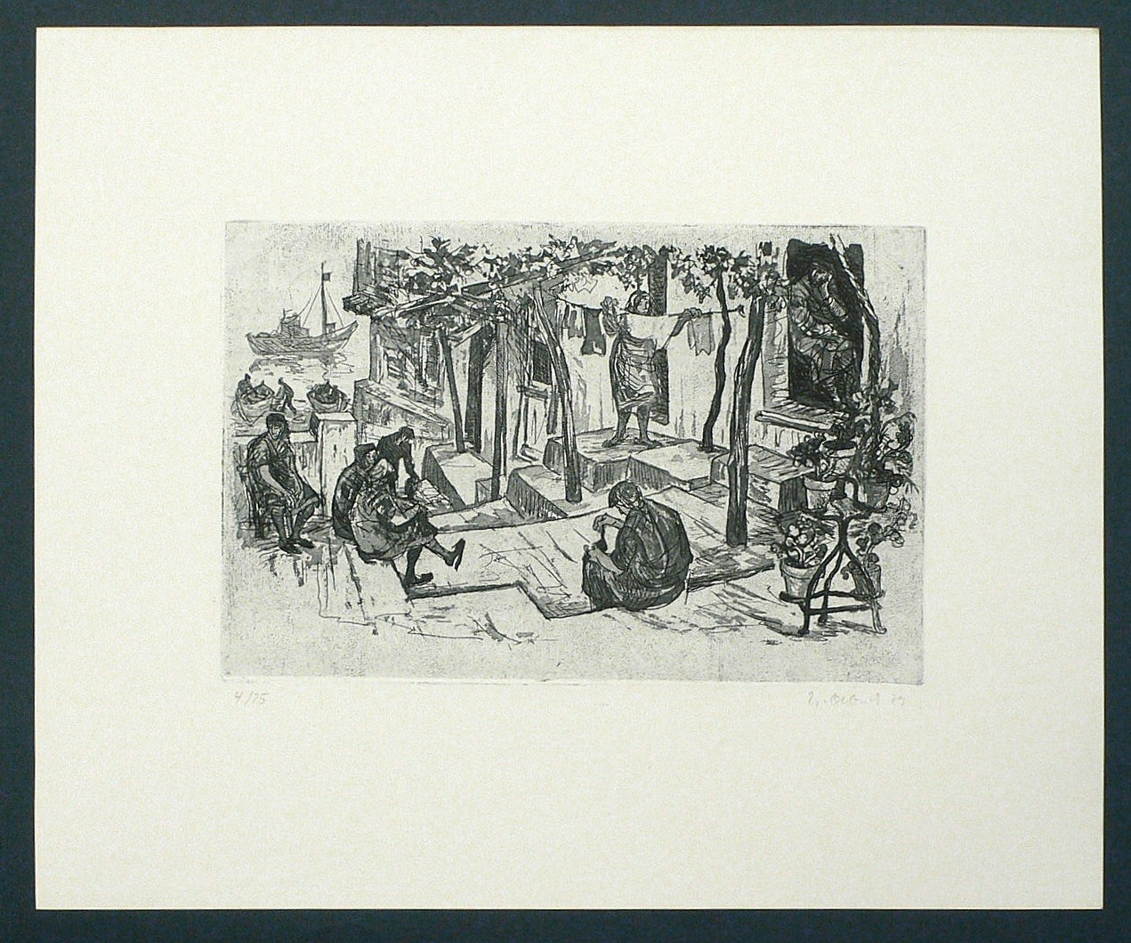 Außerhalb der Platte unten rechts in Blesitift signiert und datiert und links mit eigenhändiger Auflagenbezeichnung versehen. Verso in Bleistift betitelt. – Fischersfrauen im Hafen am Schwarzen Meer. – Unscheinbare Randmängel. Verso Reste einer ehemaligen Montierung. Guter bis sehr guter Zustand.