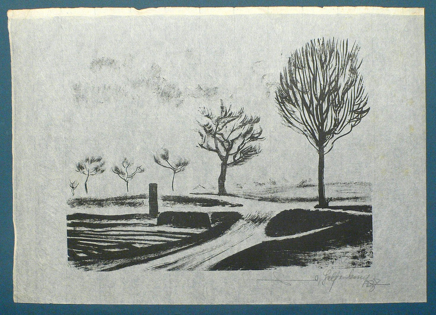 Unten rechts in Bleistift signiert und datiert. – Blatt geringfügig lichtrandig und angeschmutzt, in Ecken und Blattrand etwas knickspurig, links oben etwas stärker. Insgesamt mäßig guter Zustand.