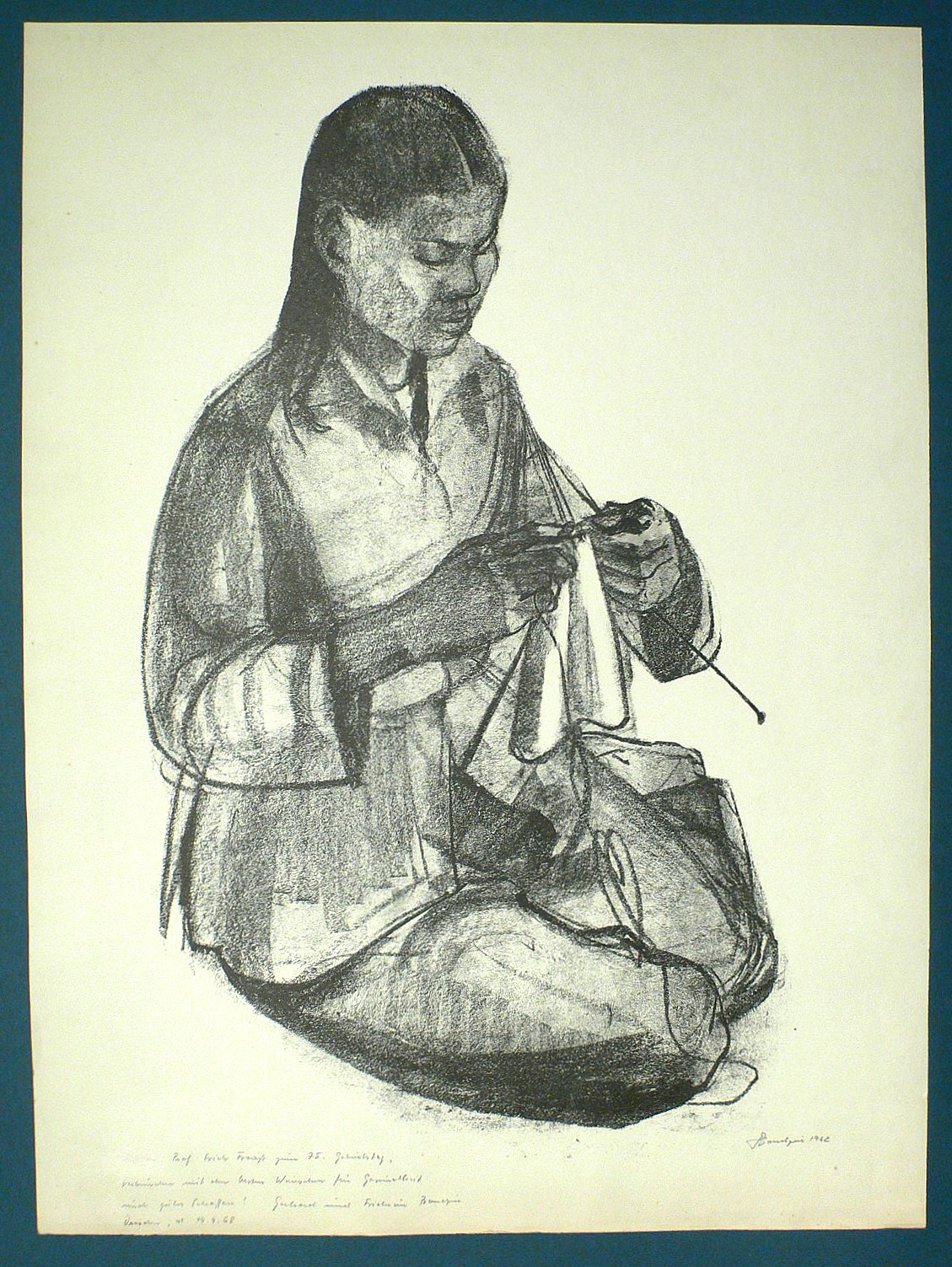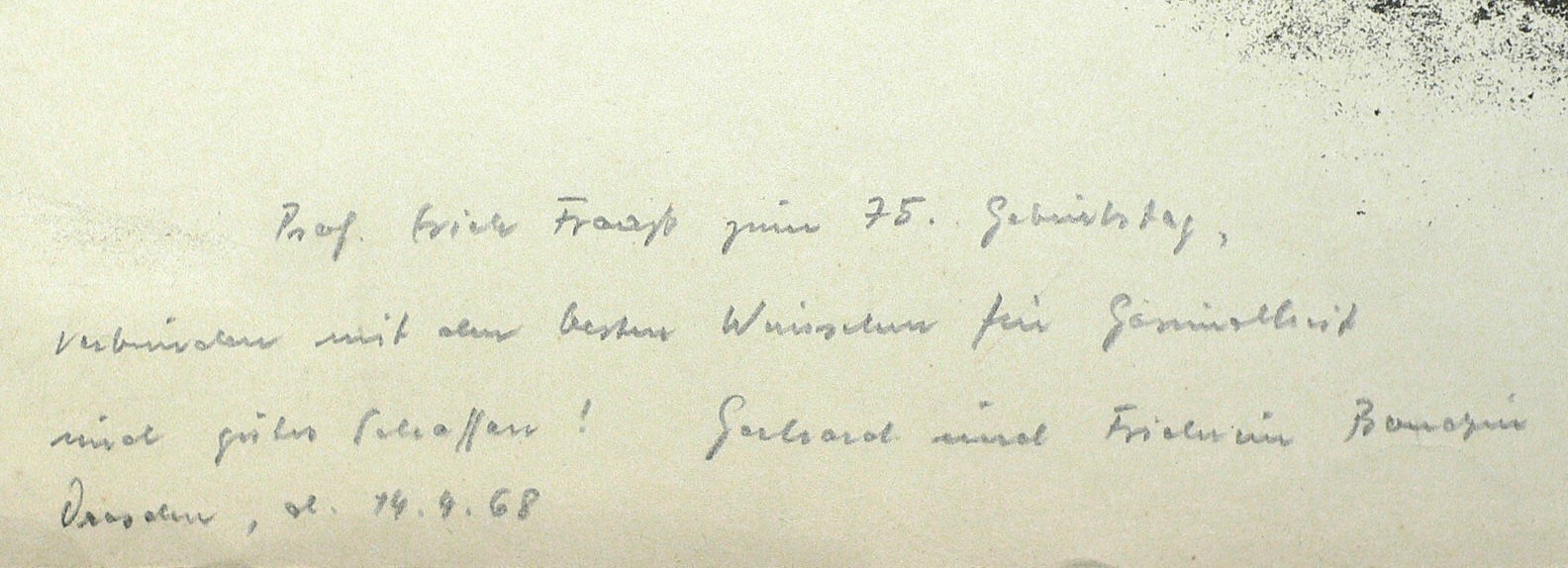 In Bleistift rechts unten signiert und datiert. Widmung unten links: ″Prof. Erich Fraaß zum 75. Geburtstag, (...)″. – Am Blattrand leicht gebräunt. Etwas fleckig und knickspurig. Insgesamt mäßig gut erhalten.