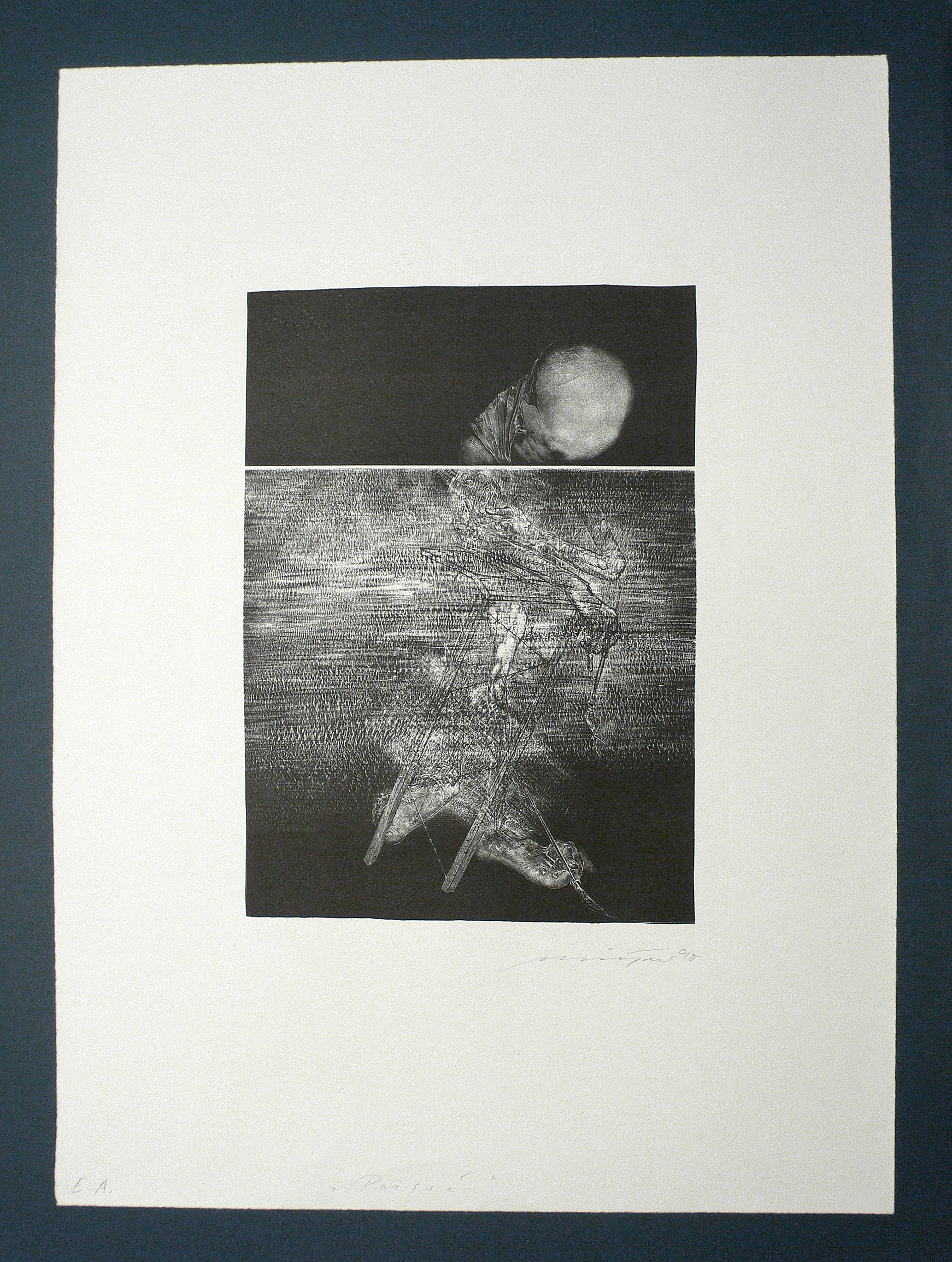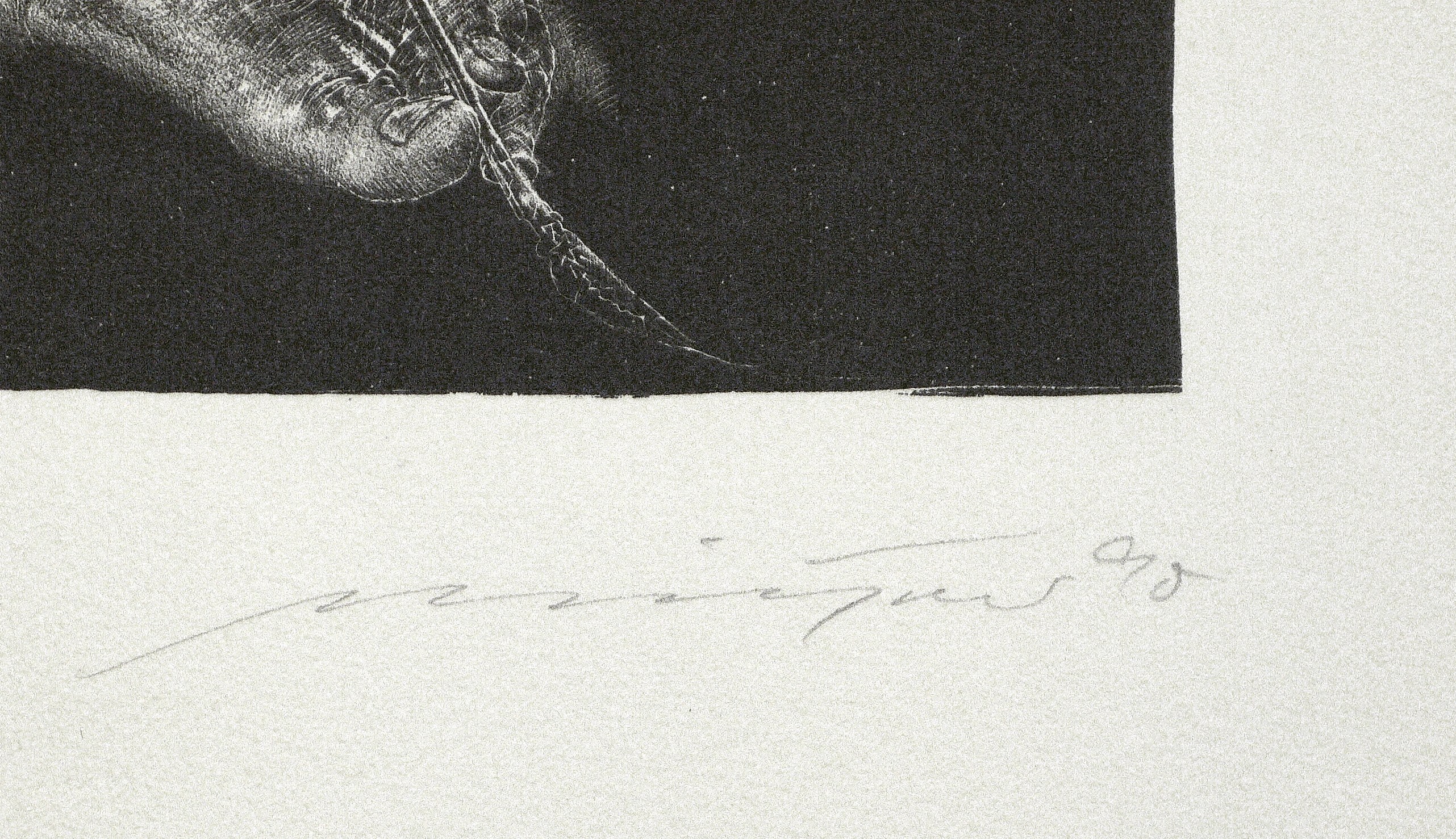 1990. Lithografie / Schablithografie, auf Büttenpapier. – Originale Künstlergrafik, von Rolf Münzner. – Künstlerexemplar. – 36,5 x 26,0 cm (Darstellung), 39,0 x 29,0 cm (Stein), 67 x 49 cm (Blatt).