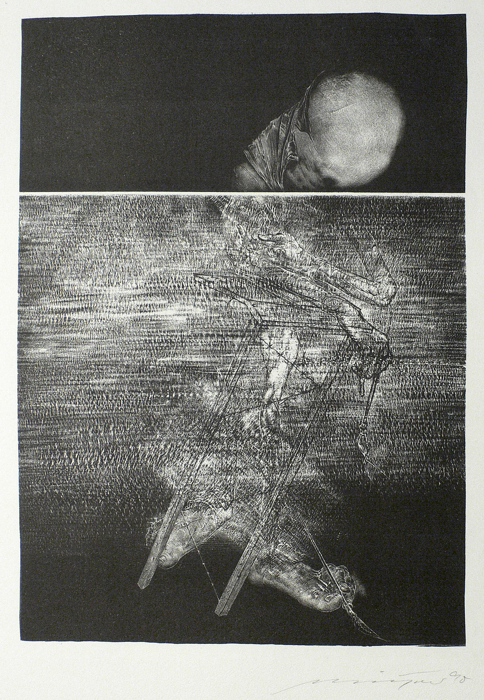 Rolf Münzner (1942 Geringswolde, lebt und arbeitet in Geithain bei Leipzig). Deutscher Zeichner und Grafiker. 1956-60 Lehre und Arbeit als Maschinenschlosser in Leisnig. 1960-62 besucht er Abendkurse an der Hochschule für Grafik und Buchkunst in Leipzig (HGB). 1962-67 Studium der Grafik und Illustration an der HGB u.a. bei Werner Tübke. 1969-72 Aspirantur. 1973-92 Lehrauftrag für Aktzeichnen und Illustration an der HGB. Seit 1990 Leiter der Werkstatt für Lithografie. Seit 1992 Professor. Seine skurrilen Figuren und bewegungsreichen Phantasiewelten werden in der seltenen Technik der Asphaltschabmanier im Steindruck umgesetzt. Detailreichtum und gesteigerte Virtuosität charakterisieren sein Werk ebenso wie eine Vorliebe für literarische Themen, denen er jeweils kongeniale Schöpfungen an die Seite stellt.