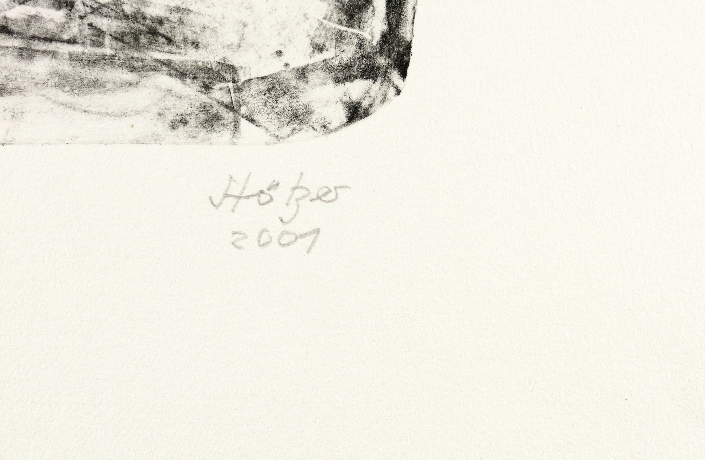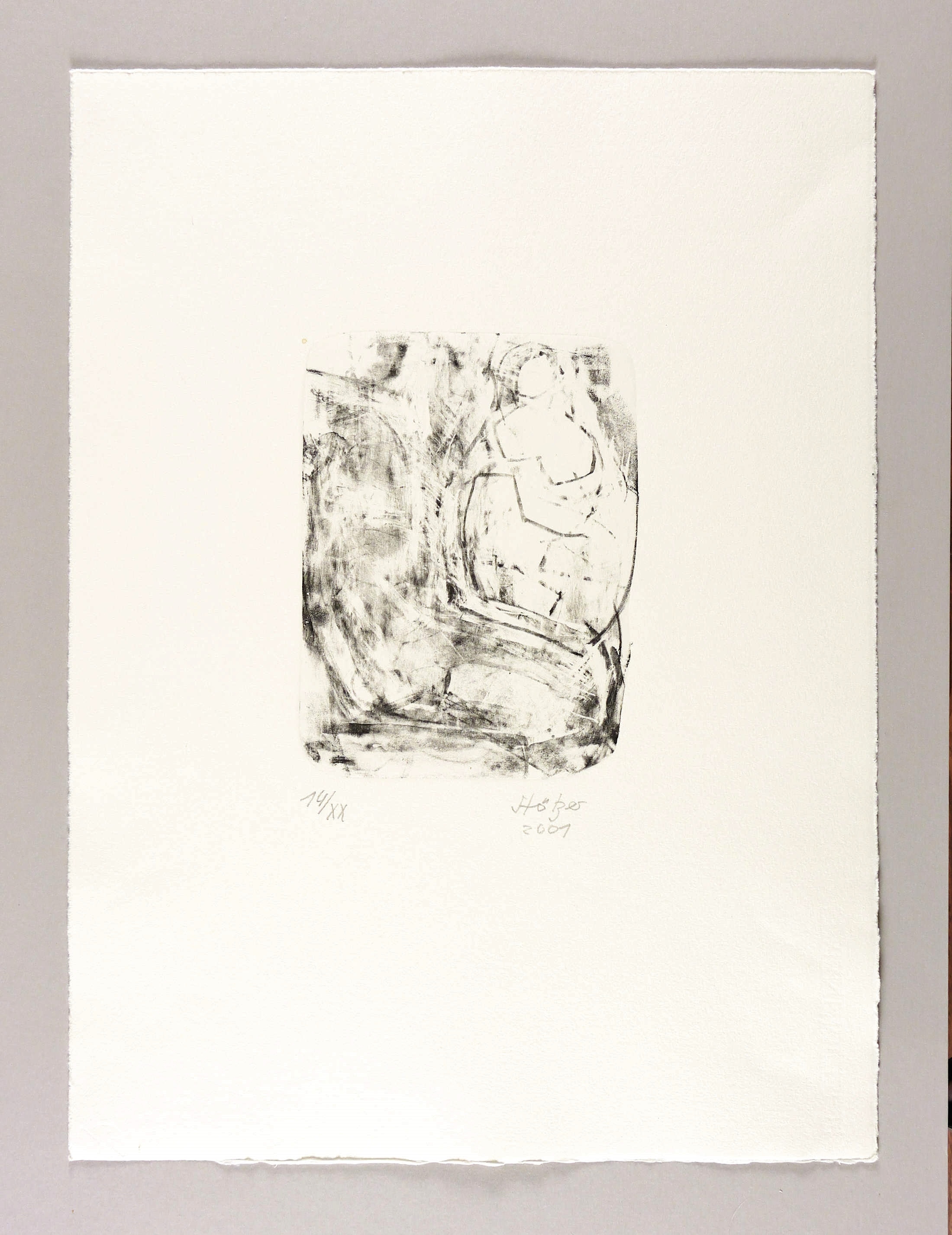 2001. Lithografie / Pinsel- & Kreidelithografie, geschabt, in Schwarz, auf hellchamois Hahnemühle-Bütten. – Originale Künstlergrafik, von Werner Stötzer. – Auflage Exemplar Nr. 14/20. – 21,6 x 16,3 cm (Darstellung / Stein), 54 x 40 cm (Blatt).