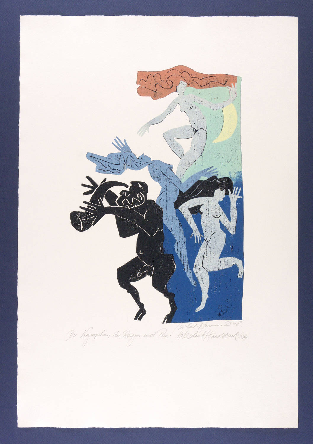 Unterhalb der Darstellung signiert und datiert rechts. Darunter Auflagenbezeichnung und bezeichnet ″Holzschnitt Handdruck″. Links betitelt. Am Blattrand rechts unten Wasserzeichen der Hahnemühle. – Syrinx. – Tadelloser Zustand.