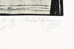 Michael Hofmann (*1944 Chemnitz, lebt und arbeitet in Radebeul). Deutscher Maler und Grafiker. 1961-65 Lehre zum Gebrauchswerber und Reproduktionsfotografen. 1969-74 Studium an der Hochschule für Bildende Künste in Dresden (HfBK). 1974-77 Meisterschüler bei Gerhard Bondzin. Seit 1977 freischaffend tätig; Mitglied des Verbandes Bildender Künstler. Seit 2002 Dozent an der freien Akademie in Bad Reichenhall.