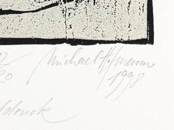 Michael Hofmann (*1944 Chemnitz, lebt und arbeitet in Radebeul). Deutscher Maler und Grafiker. 1961-65 Lehre zum Gebrauchswerber und Reproduktionsfotografen. 1969-74 Studium an der Hochschule für Bildende Künste in Dresden (HfBK). 1974-77 Meisterschüler bei Gerhard Bondzin. Seit 1977 freischaffend tätig; Mitglied des Verbandes Bildender Künstler. Seit 2002 Dozent an der freien Akademie in Bad Reichenhall.