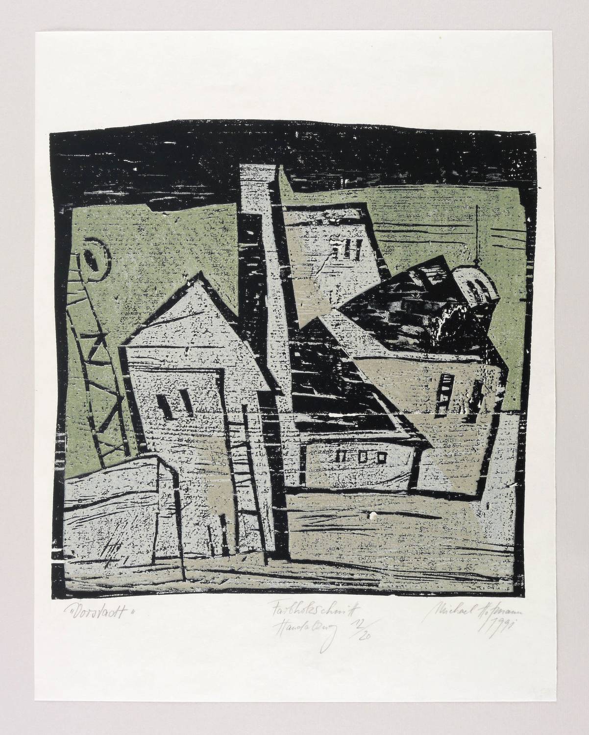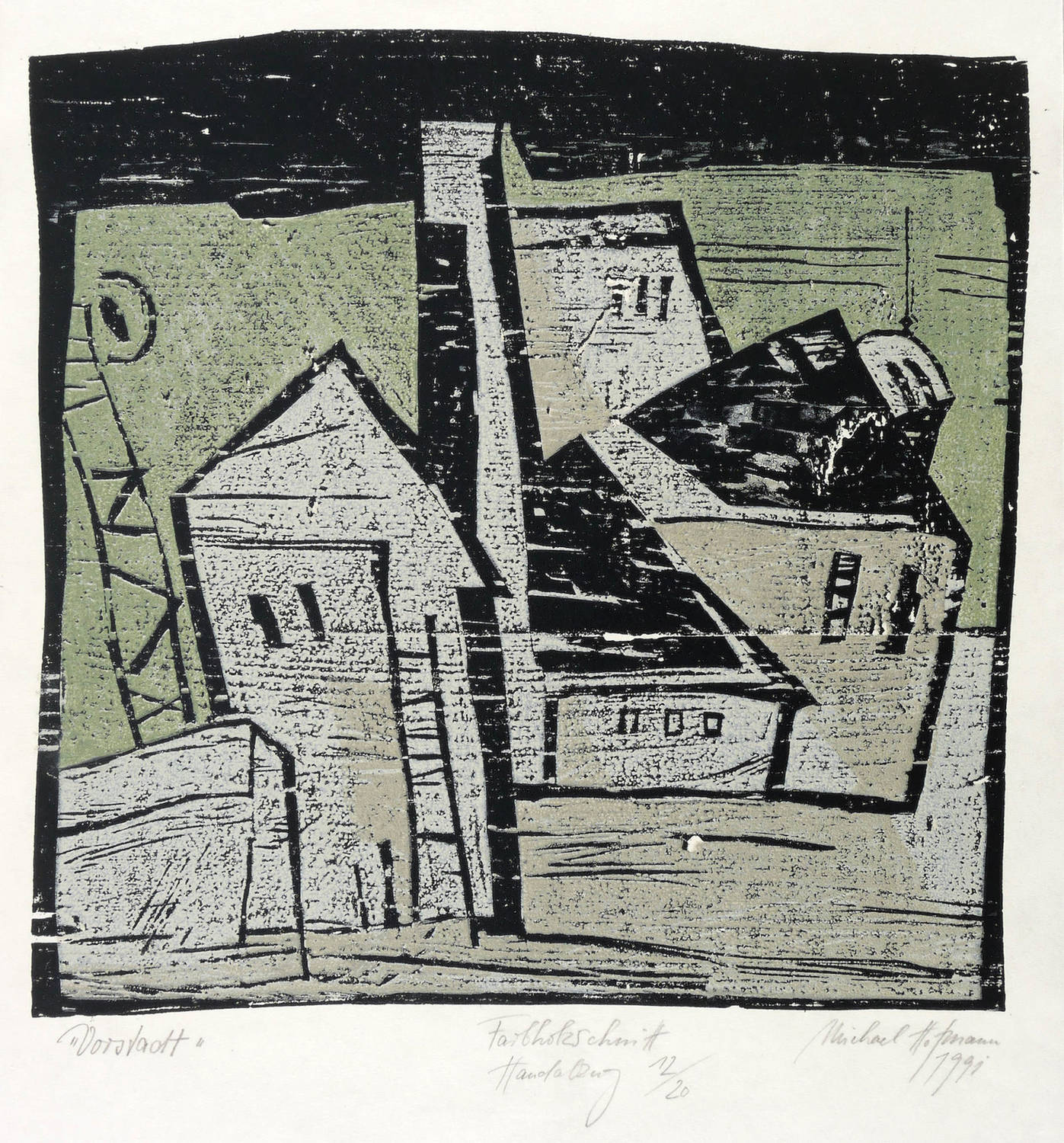 1991. Farbholzschnitt, auf Velin. – Von Michael Hofmann. – Auflage Exemplar Nr. 12/20. – 34 x 35 cm (Darstellung / Druckstock), 48 x 37,5 cm (Blatt).