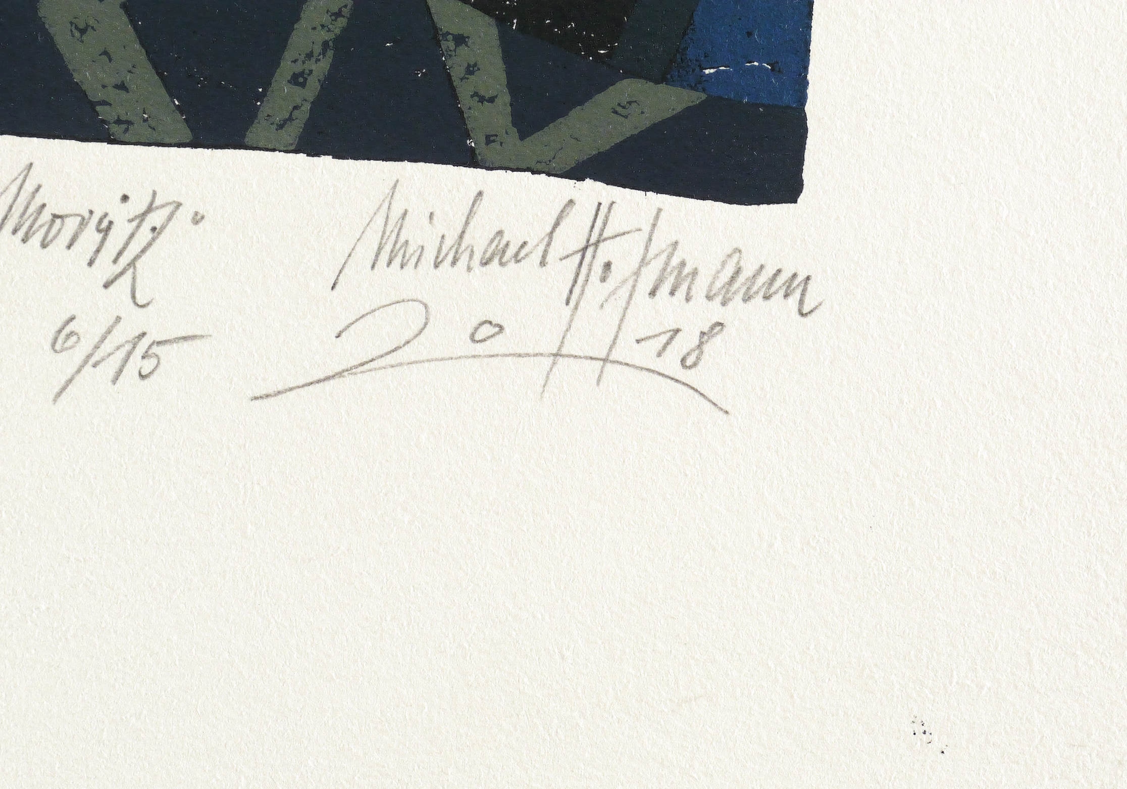 2018. Farbholzschnitt, auf Bütten. – Originale Künstlergrafik, von Michael Hofmann. – Auflage Exemplar Nr. 6/15. – 38,7 x 25,6 cm (Darstellung / Druckstock), 68 x 37,5 cm (Blatt).