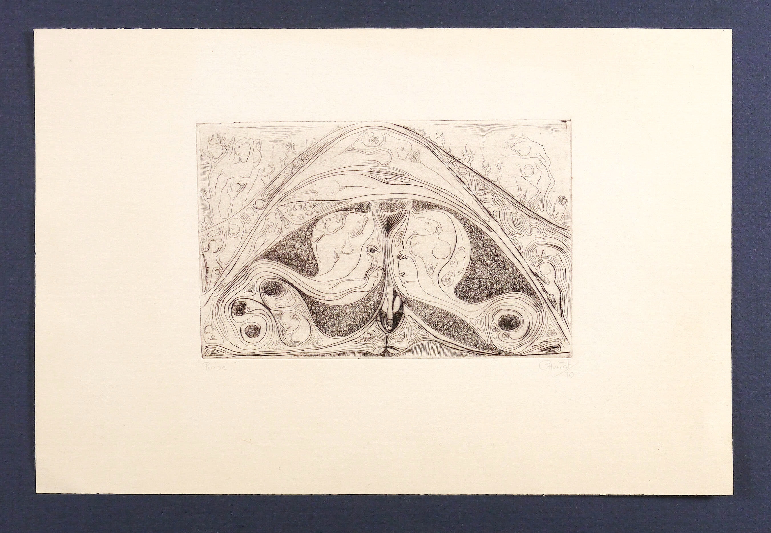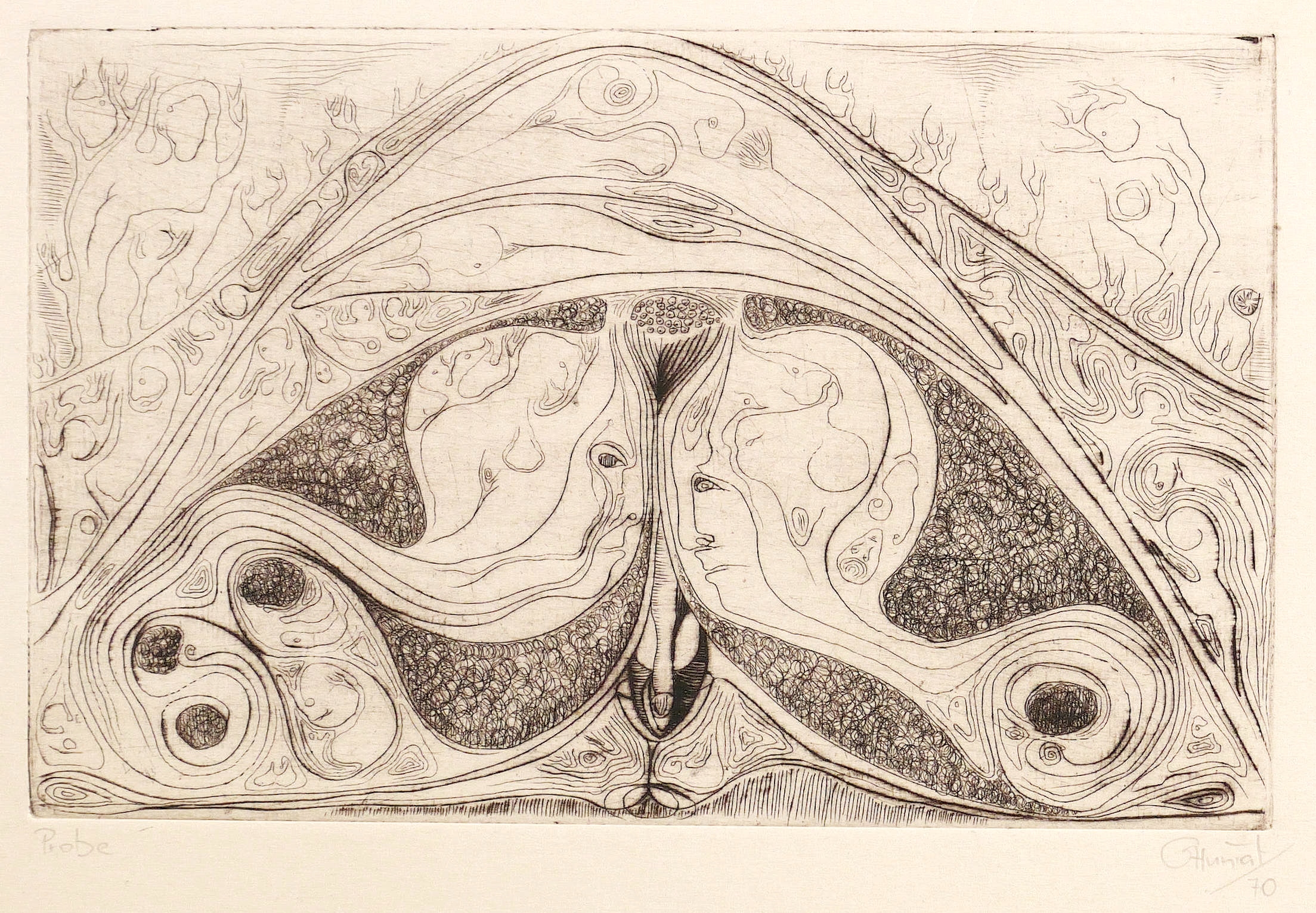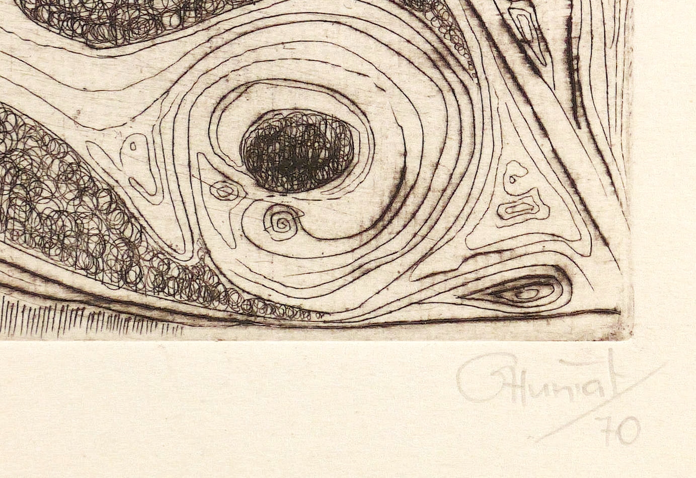1970. Radierung / Strichätzung & Kaltnadel, in Schwarzviolett, auf hellem Velinkarton. – Originale Künstlergrafik, von Günther Huniat. – Probedruck. – 9,6 x 15,1 cm (Darstellung / Platte), 19 x 28 cm (Blatt).