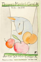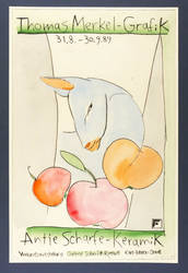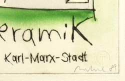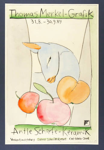 Rechts unten in Bleistift signiert und datiert. Links Auflagenbezeichnung. Diverse Inschriften in der Platte. – Originalgrafisches Künstlerplakat zur Ausstellung ″Thomas Merkel Grafik - Antje Scharfe Keramik″ in der Galerie Schmidt- Rottluff, Karl-Marx-Stadt 1989. – Die Ecken unscheinbar bestoßen. Sonst sehr guter Zustand.