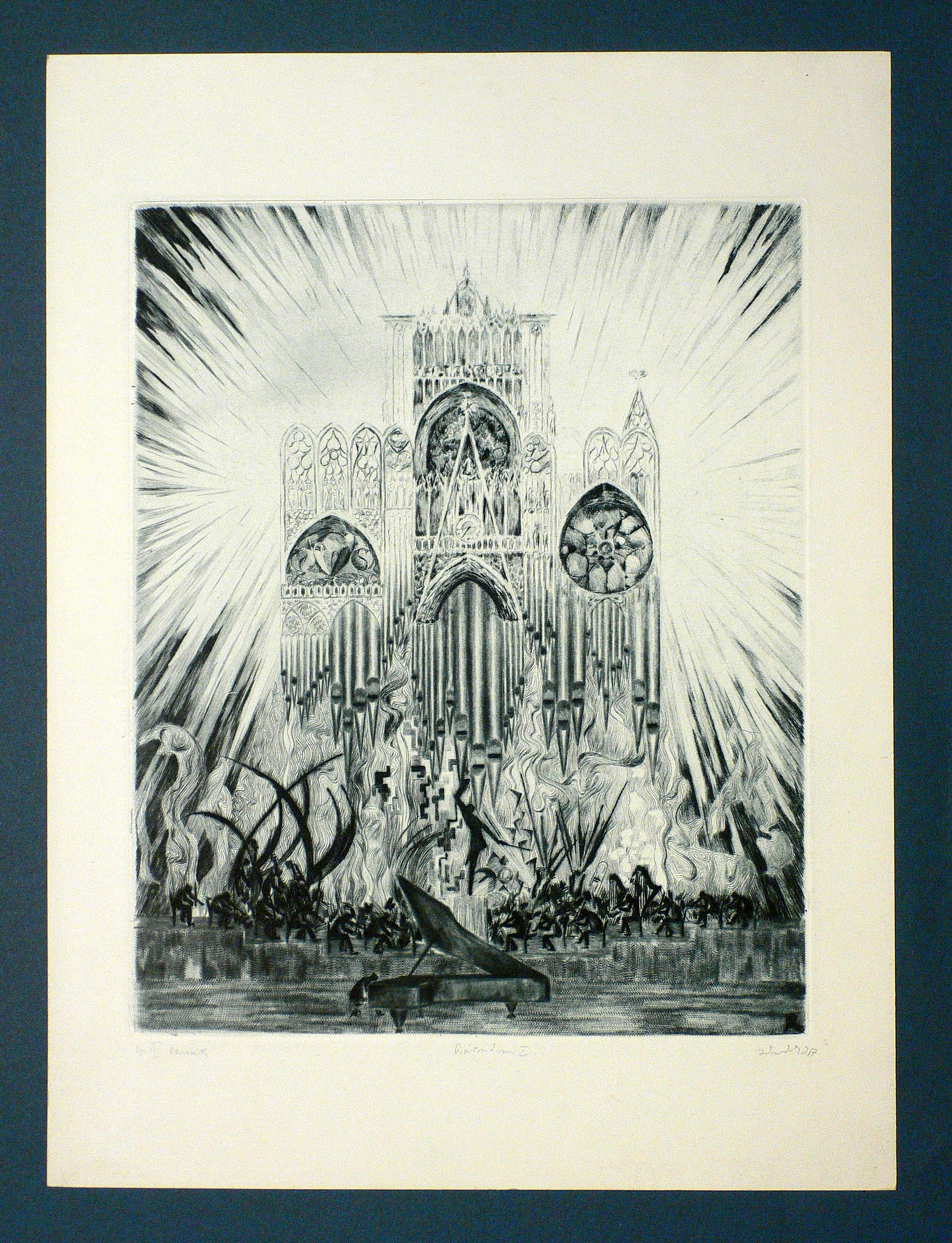 Alexander Friedrich (1895 Hamburg - 1968 Hamburg). Deutscher Radierkünstler, Holzschneider und Mosaizist des frühen Expressionismus in Hamburg. 1913-18 Schüler von Carl Otto Czeschka in Hamburg. Friedrich war Mitglied der expressionistischen Künstlergruppe "Kräfte" in Hamburg (mit Kinner von Dresler, Paul Adolf Seehaus, Andreas Luksch und Peter Luksch). Zu seinen Künstlerfreunden zählte Johannes Wüsten, der ihn porträtierte und ihm seine Erzählung "Ywon - Eine Geschichte vom doppelten Leben" widmete. Seine stark dem Expressionismus verpflichteten Bilderfindungen bewegen sich zwischen realistischer Naturschilderung und bizarrer Phantastik. Seine grafischen Mappenwerke (darunter Faust II, Musik, Inkarnationen, In aspectu orbis, Der Stein & Schwerindustrie) gelten aufgrund der niedrigen Auflagen als selten. In der Radierung neigte er zum experimentellen Ausweiten technischer Grenzen. Er beschäftigte sich mit Hercules Pieterszoon Seghers und der Geschichte des Tiefdrucks, wozu er das Buch "Handlung und Gestalt des Kupferstiches und der Radierung" (Essen: Fredebeul & Koenen 1931) veröffentlichte.
