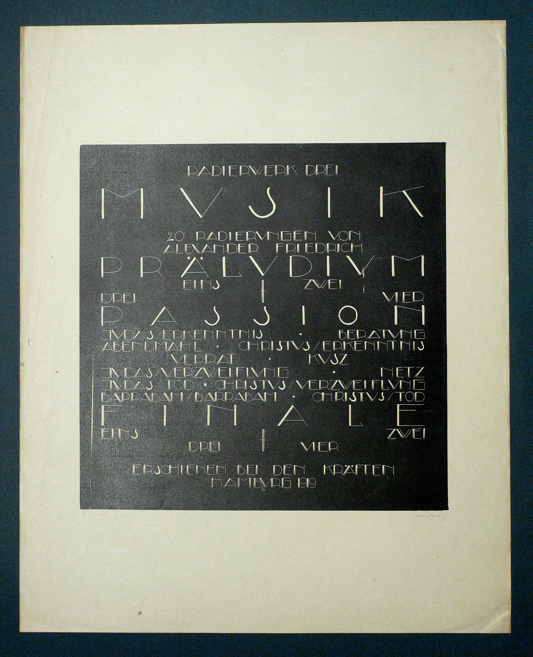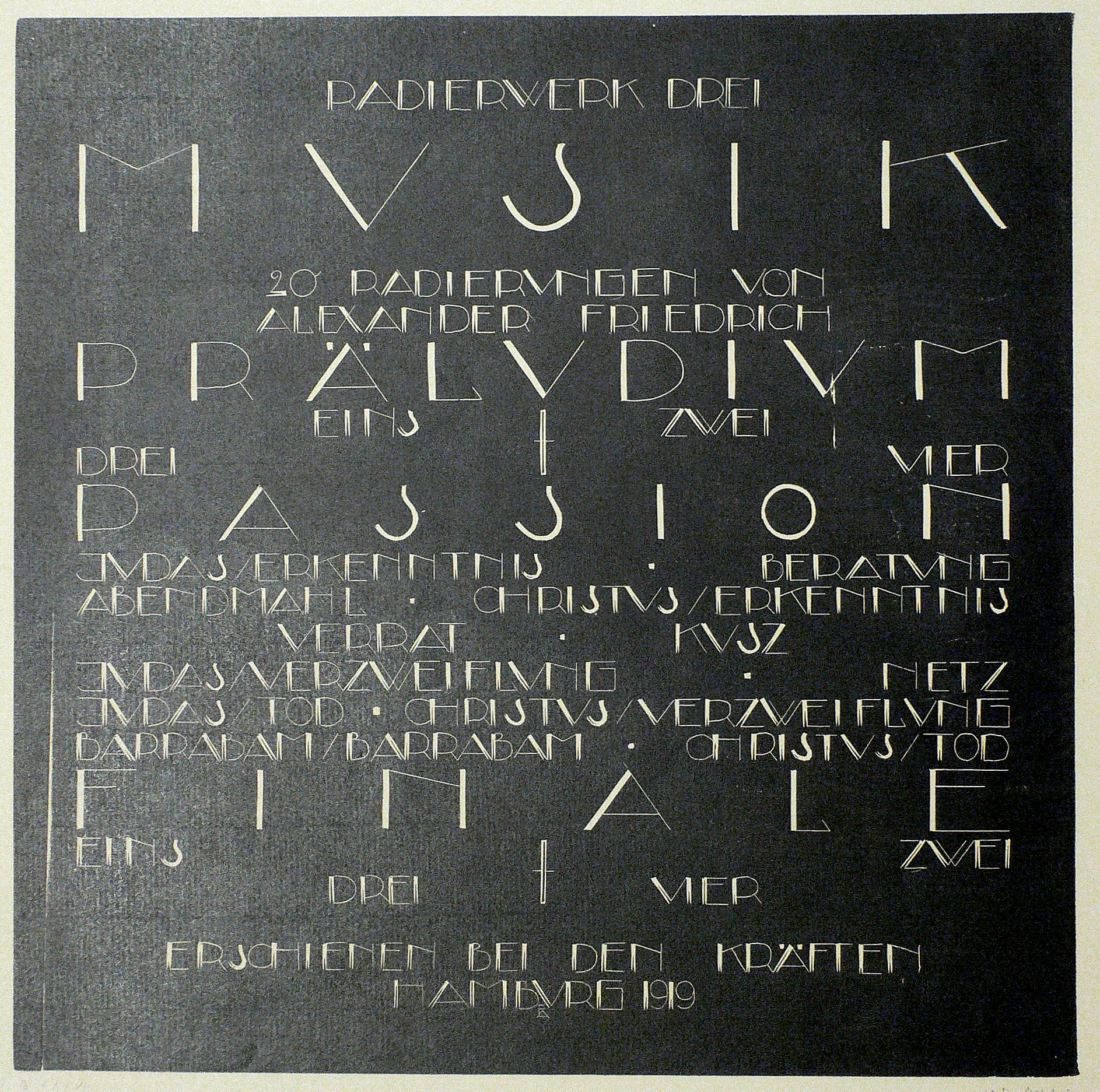 Aus: Alexander Friedrich, Musik. 20 Radierungen (Hamburg: Die Kräfte 1919). – Nicht handsigniert. Im Druckstock bezeichnet: ″Papierwerk III. - Musik - 20 Radierungen von Alexander Friedrich - Präludium Eins - Zwei - Drei - Vier. - Passion . - Judas/Erkenntnis - Beratung - Abendmahl - Christus/Erkenntnis - Verrat - Kusz - Judas/ Verzweiflung - Barrabam/ Barrabam - Christus/ Tod - Finale - Eins - Zwei - Drei - Vier. - Erschienen bei den Kräften. - Hamburg 1919″. – Titelblatt und Inhaltsverzeichnis zur Radierfolge ″Musik Opus III″ des Künstlers. – Guter bis mäßig guter Zustand.