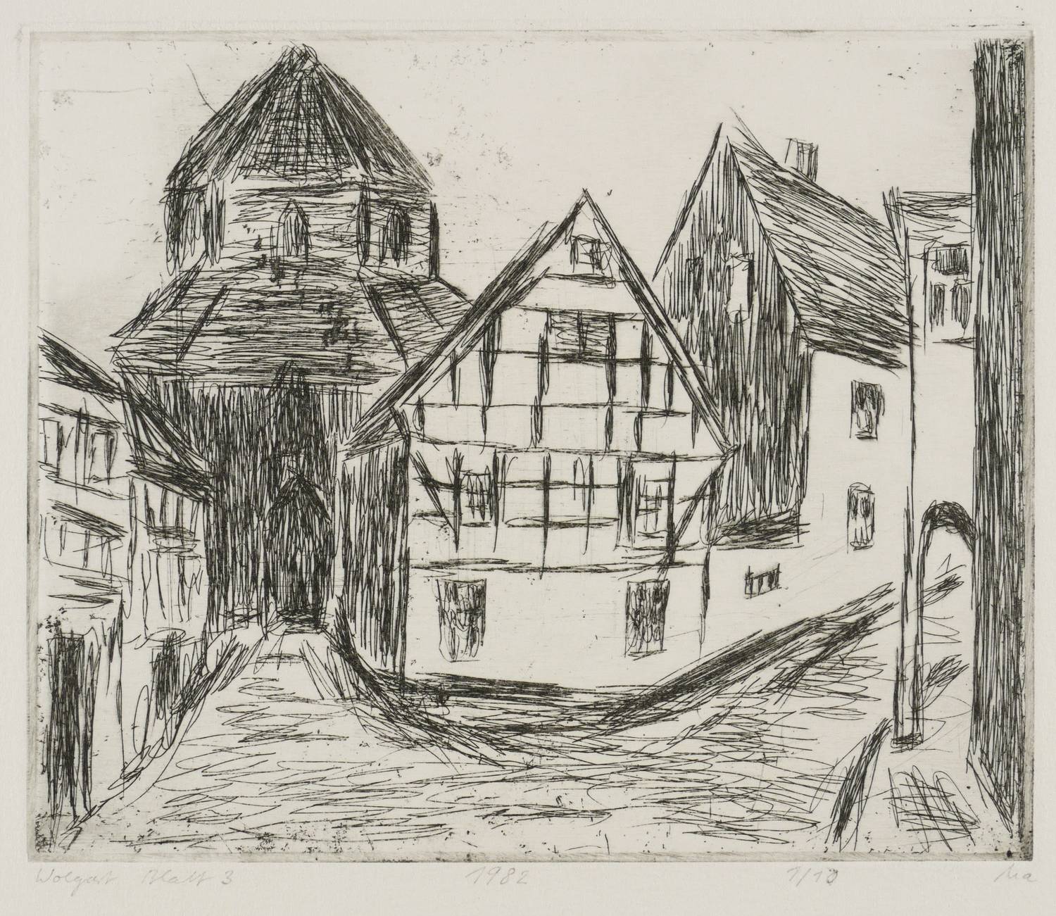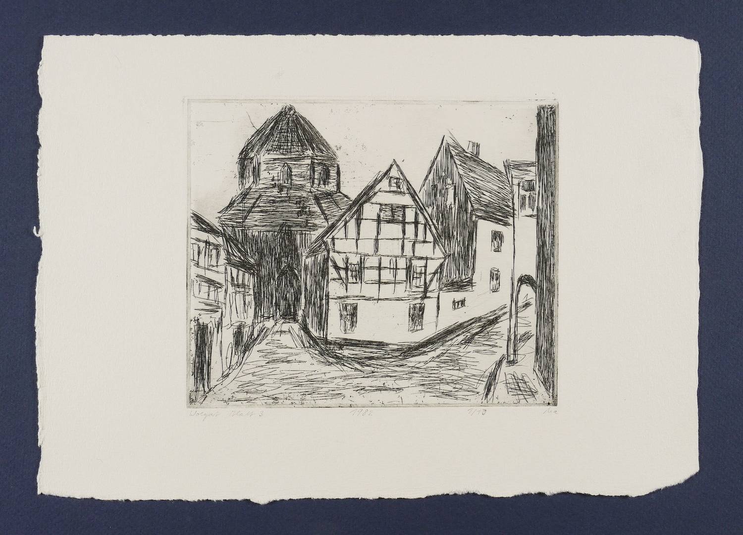1982. Radierung / Strichätzung & Kaltnadel, in Schwarz, auf hellchamois Velin. – Originale Künstlergrafik, von Marlis Lilge. – Auflage Exemplar Nr. 1/10. – 13,0 x 15,8 cm (Darstellung / Platte), 20 x 29 cm (Blatt).