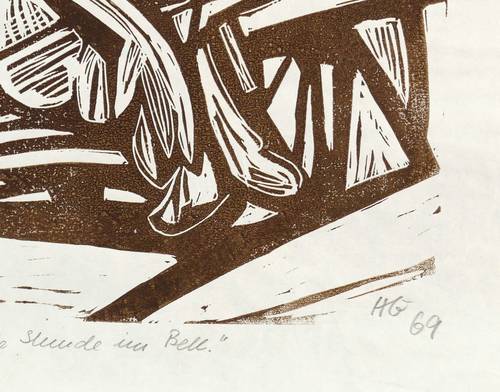 Rechts unten in Bleistift monogrammiert und datiert: ″HG 69″. Links Auflagenbezeichnung und Titel. – Papier stärker knickspurig, Rückseite leicht gebräunt. Insgesamt mäßig guter Zustand.