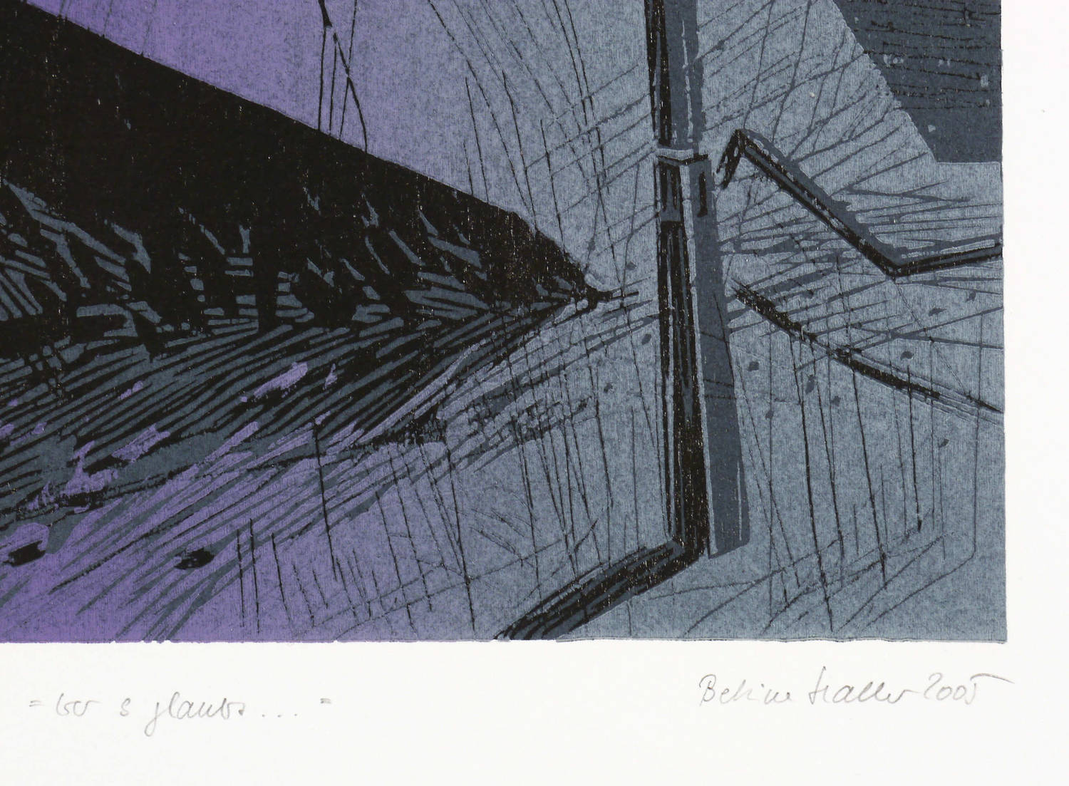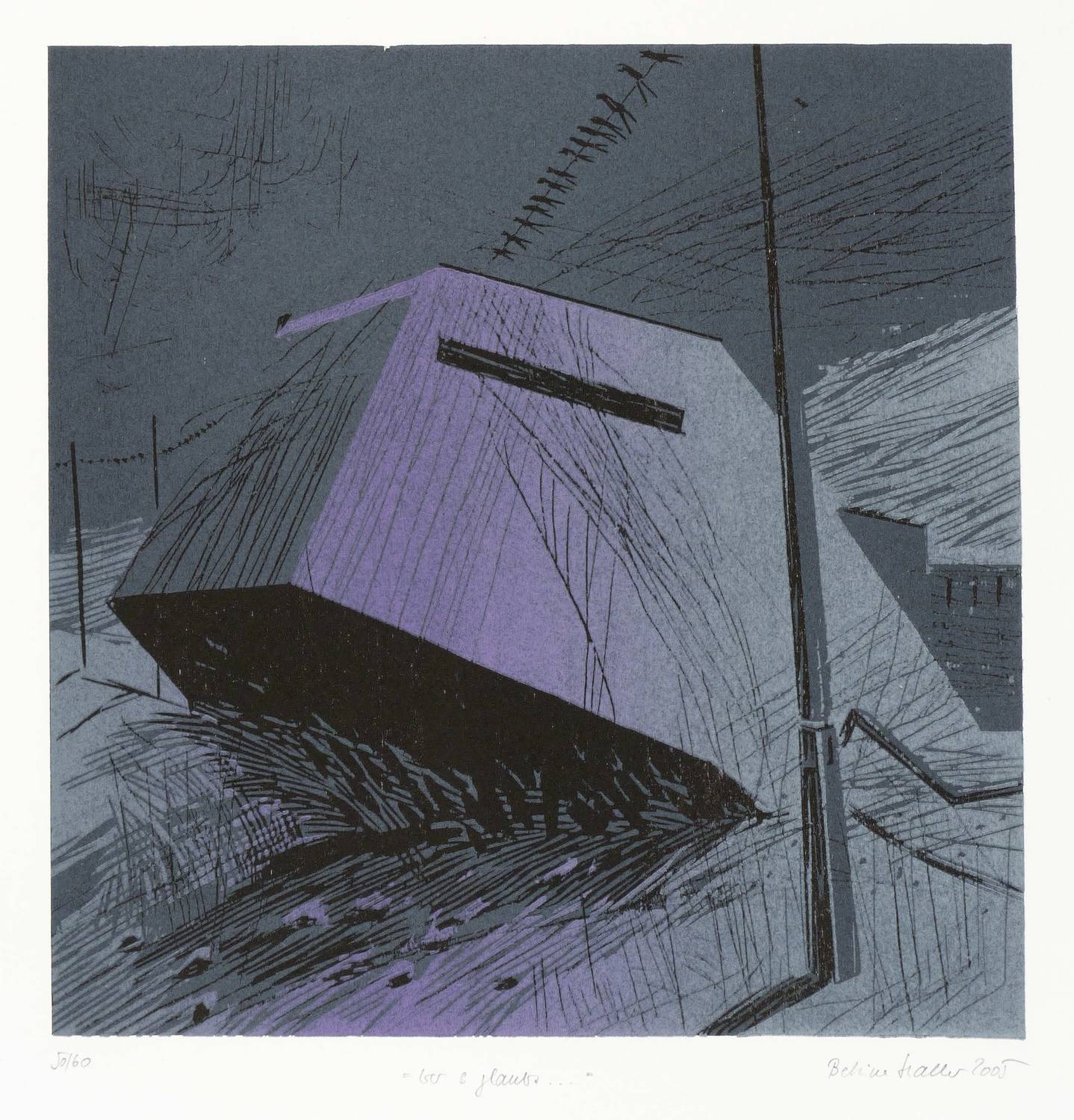 2005. Farbholzschnitt, in 3 Farben, auf Somerset-Bütten. – Originale Künstlergrafik, von Bettina Haller. – Auflage Exemplar Nr. 50/60. – 22,4 x 22,0 cm (Darstellung), 40 x 26 cm (Blatt).