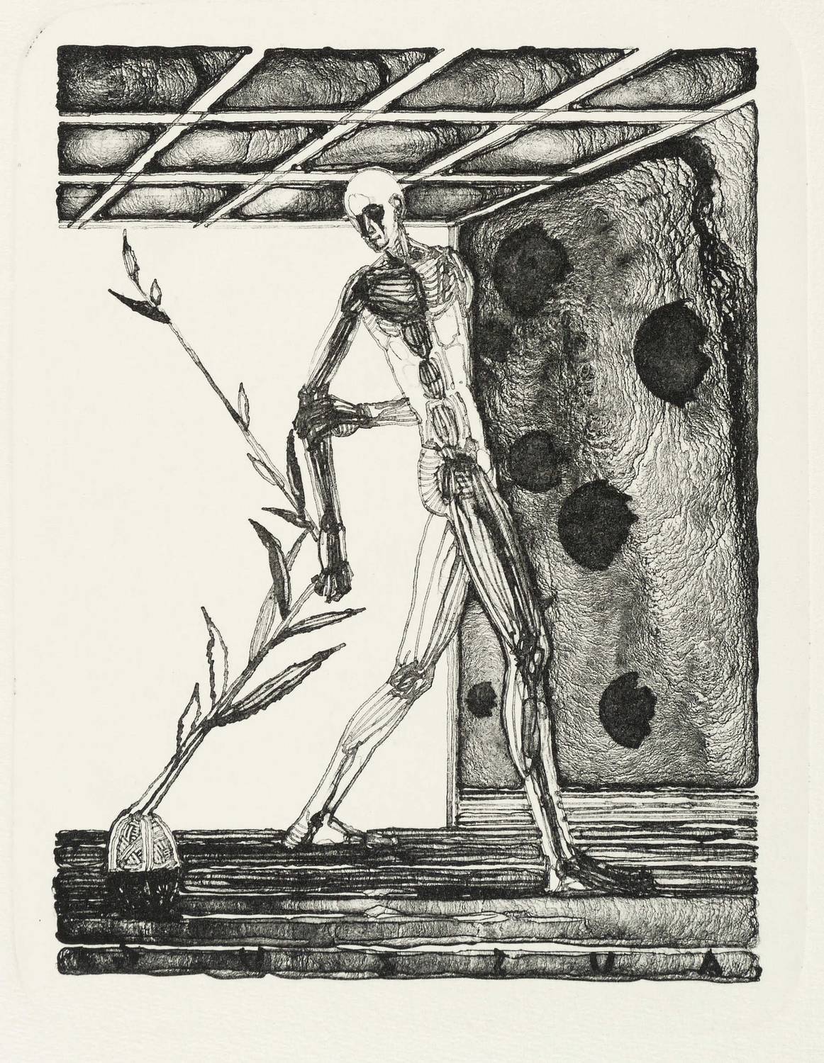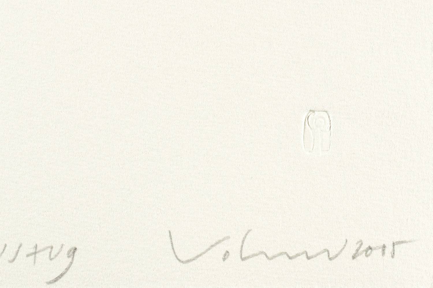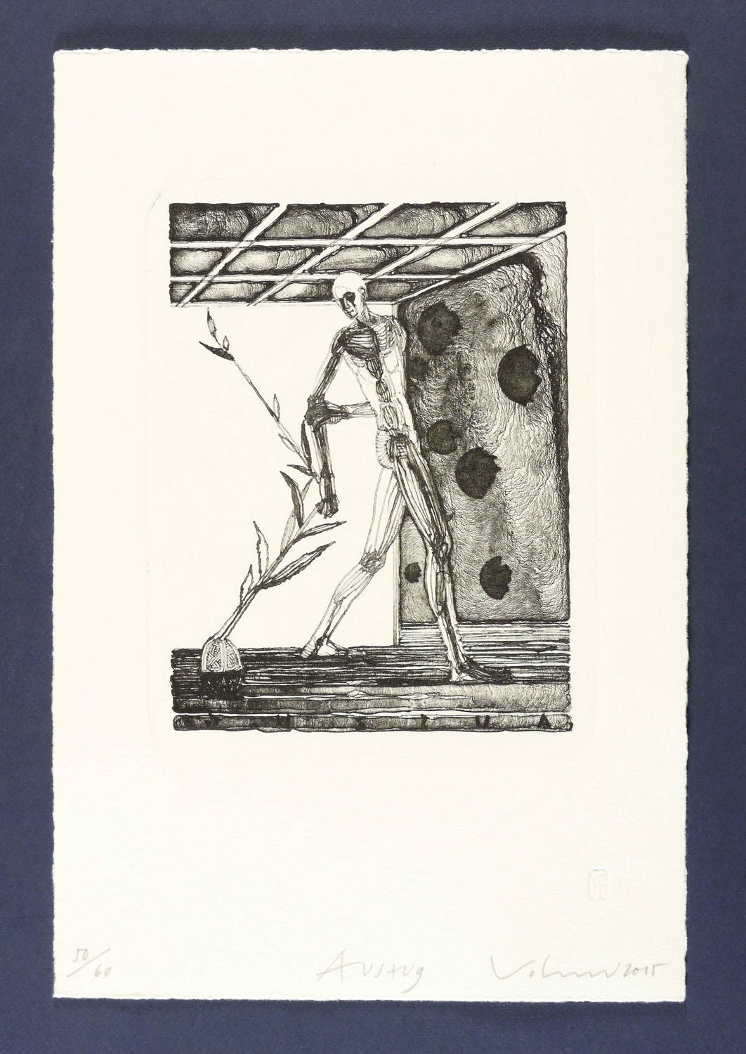 Steffen Volmer (*1955 Dresden, lebt und arbeitet in Chemnitz). Deutscher Maler, Grafiker und Buchillustrator. 1976-81 Studium an der Hochschule für Grafik und Buchkunst in Leipzig. 1982-84 Meisterschüler an der Hochschule der Bildenden Künste in Dresden bei Gerhard Kettner. Seit 1981 entstanden viele Mappenwerke und originalgrafische Bücher. 1996 Preisträger 'Die schönsten deutschen Bücher'. 1985 gründete er die Voste-Edition, einen Eigenverlag für originalgrafische Bücher und Mappenwerke. Neben Teezeichnungen (Tee als Zeichenmittel in Verbindung mit Notentinte und chinesischer Tusche) entstehen Papiermontagen, Zeichenskulpturen aus Eisenguss, Stereoskopisches Zeichnungen auf mattierten Acrylglasplatten und andere experimentelle Arbeiten.