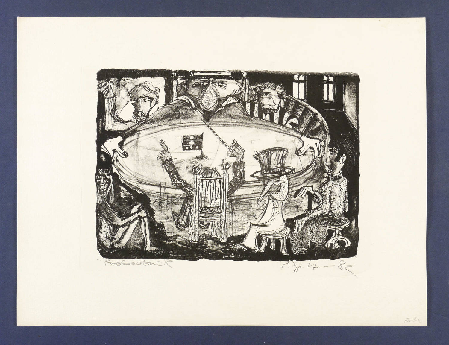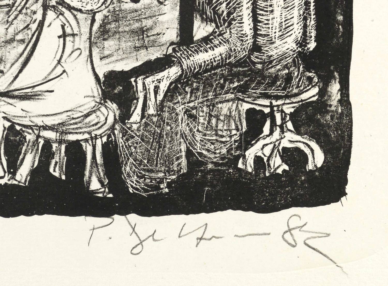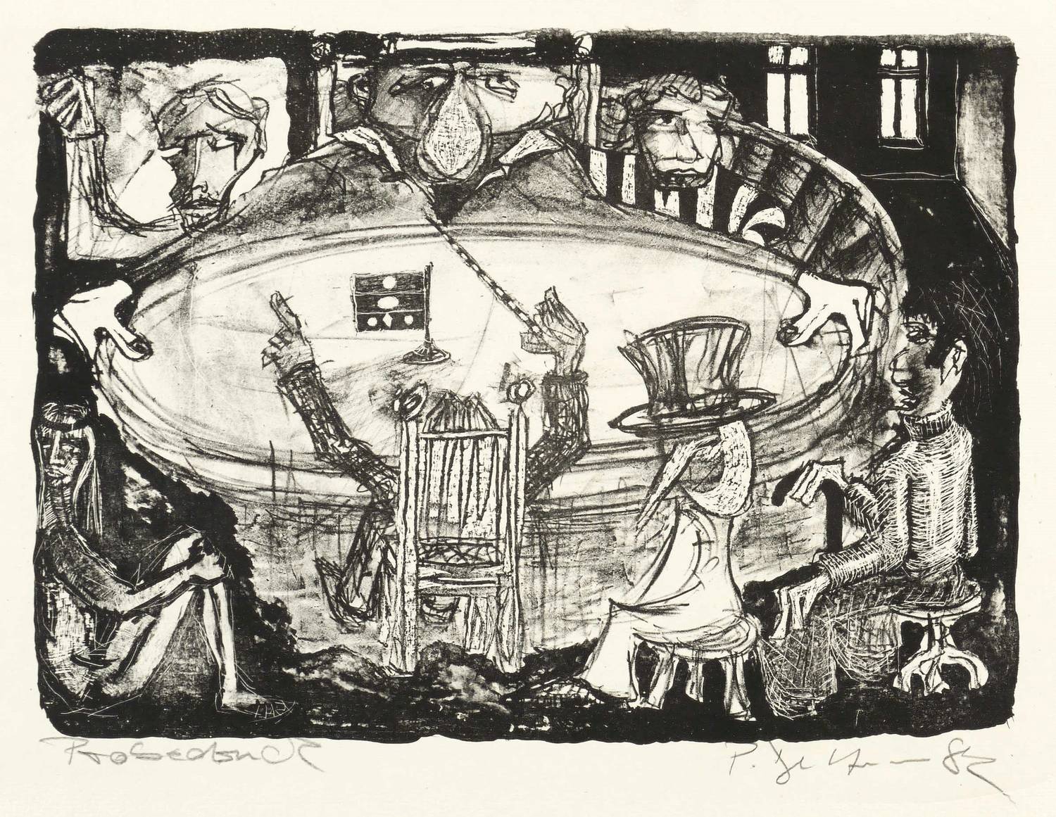 1982. Lithografie / Pinsel- & Kreidelithografie, partiell geschabt, in Schwarz, auf Karton. – Originale Künstlergrafik, von Peter Dettmann. – Probedruck. – 22,4 x 31,0 cm (Darstellung), 36,5 x 48 cm (Blatt).