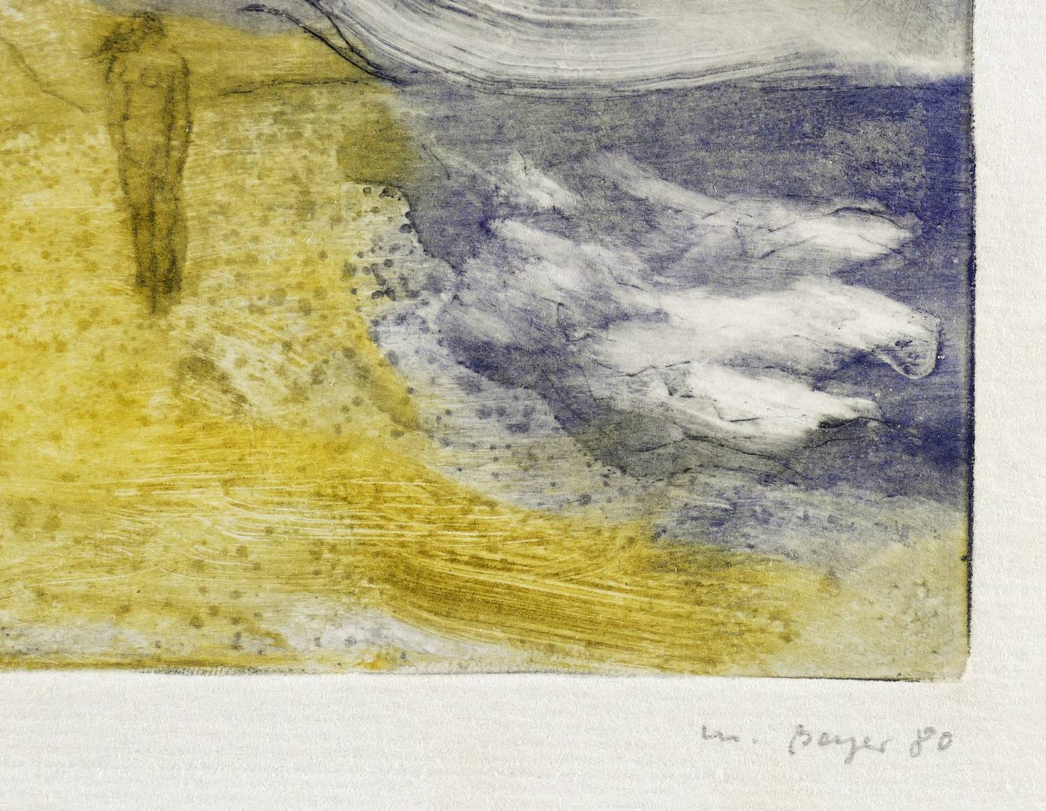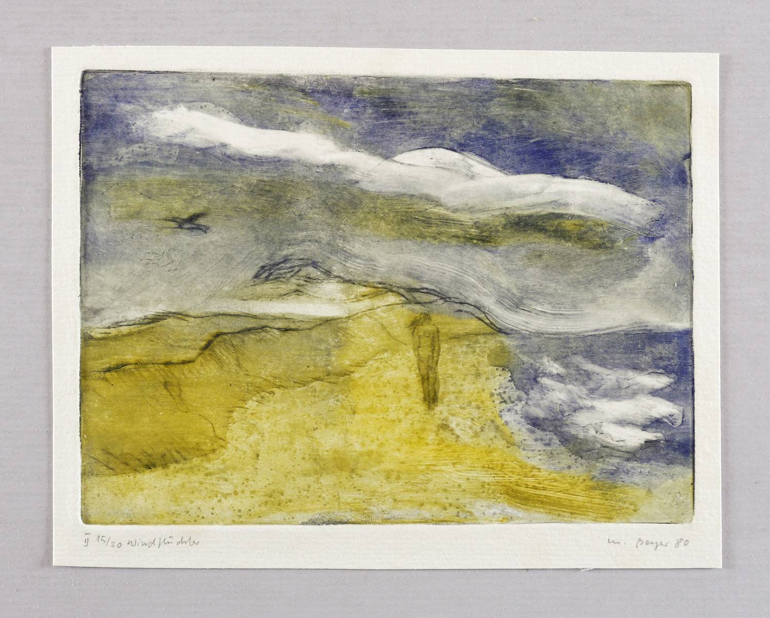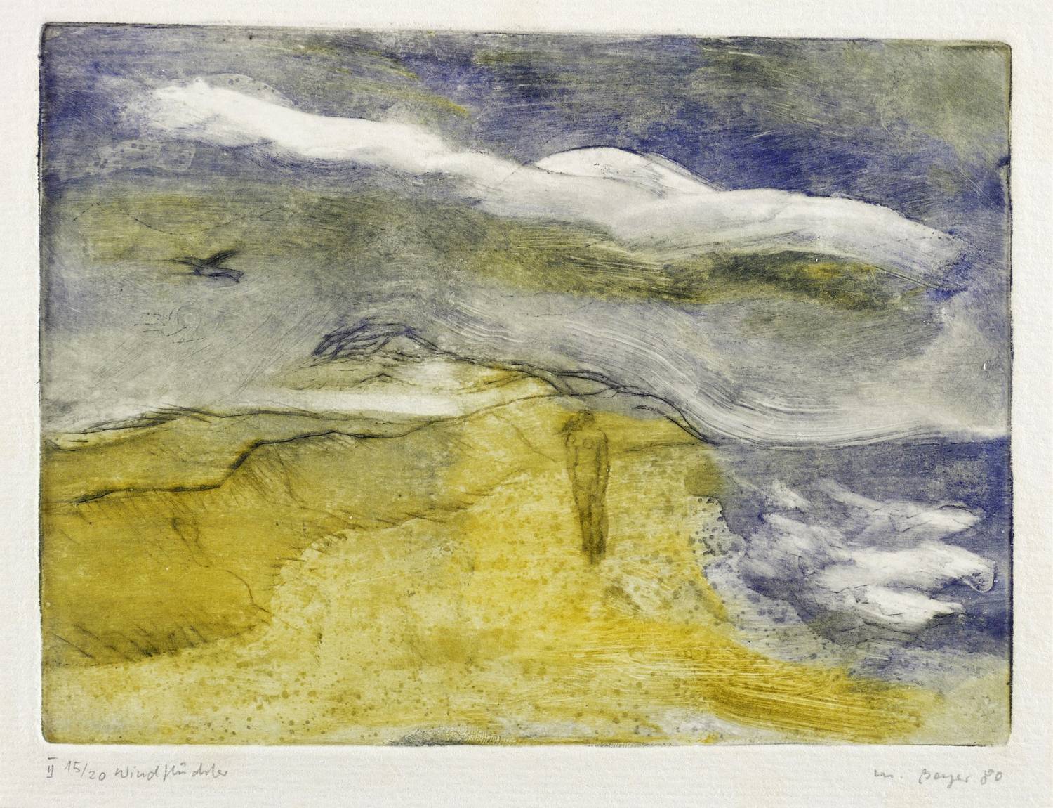 Rechts unten in Bleistift signiert und datiert: ″M. Beyer 80″. Links Auflagenbezeichnung und Titel: ″II 15/20 Windflüchter″. – Sehr guter Zustand.