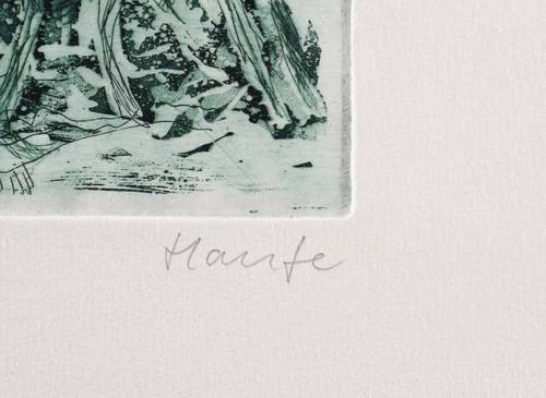 1975-1980. Farbradierung / Aquatinta, Reservage & Strichätzung, in Schwarz & Türkis, auf hellchamois Velinkarton. – Originale Künstlergrafik, von Jürgen Haufe. – Auflage Exemplar Nr. 15/80. – 24 x 27 cm (Blatt), 12,3 x 16,4 cm (Darstellung / Druckbild).