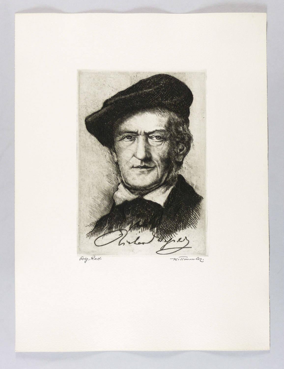 Rechts unten in Bleistift signiert: ″K. Timmler″. Links bezeichnet: ″Orig. Rad.″ In der Platte unten mit imitiertem Namenszug betitelt: ″Richard Wagner″. – Ohne Mängel. Tadellos. Sehr guter Zustand.
